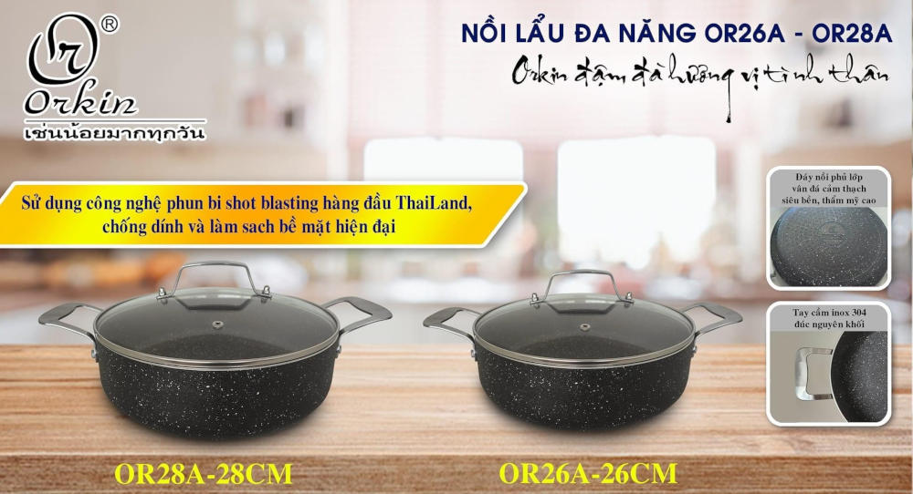 Nồi lẩu chống dính vân đá Orkin Thái Lan, vung kính đáy từ Tên sản phẩm: Chảo lẩu chống dính vân đá đáy từ Thương hiệu: Orkin Thái Lan Công nghệ sản xuất Thái Lan