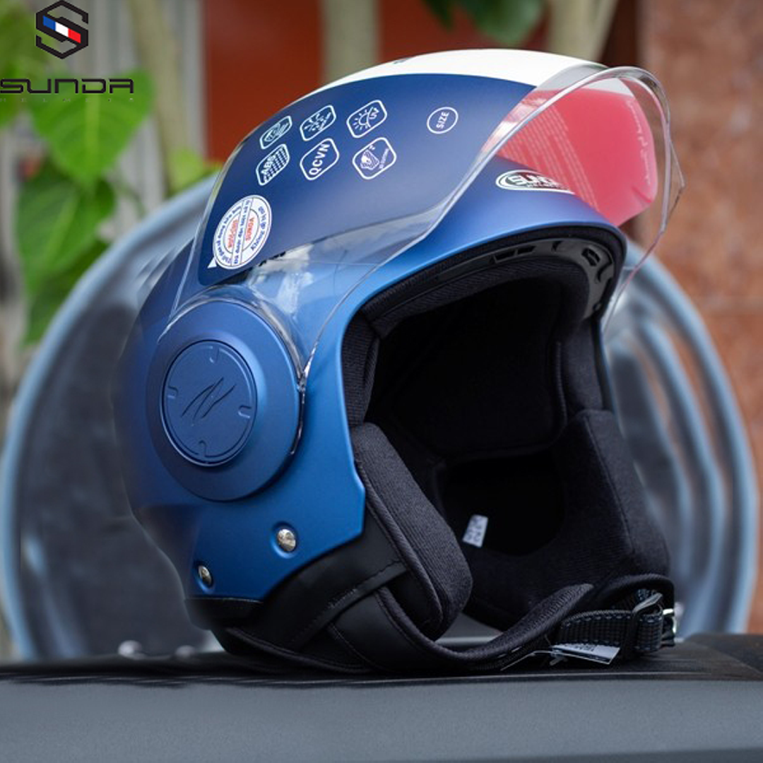 Mũ bảo hiểm nửa đầu có kính Sunda 180B tem là phụ kiện không thể thiếu khi đi xe mô tô, xe máy, mang lại sự an toàn và phong cách thời trang cho người sử