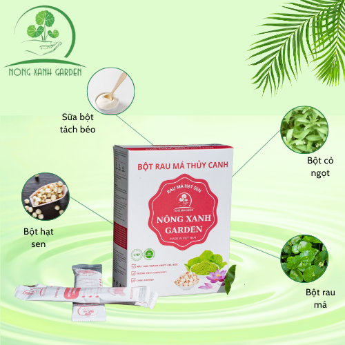 Hộp Bột Rau Má Thủy Canh Hạt Sen Nông Xanh Garden 150GR Sản phẩm thực phẩm bổ sung Bột rau má thủy canh hạt sen được kết hợp hài hòa giữa hương vị thanh mát của hạt sen, vị béo ngậy của nước cốt dừa và rau má thủy canh tươi được làm sạch bằng phương pháp sục Ozone kết hợp kỹ thuật sấy lạnh và công nghệ nghiền cối đá siêu mịn từ Nhật Bản nên giữ nguyên vẹn được màu sắc, hương vị và giá trị dinh dưỡng của rau má.