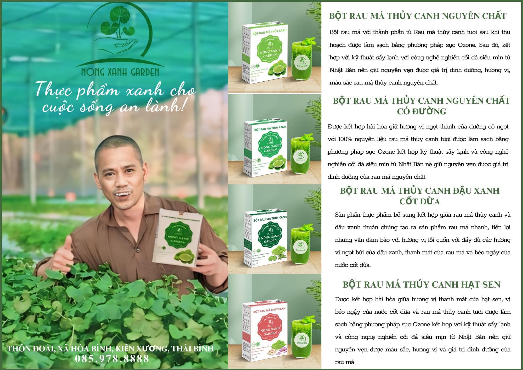 Rau má thủy canh của Nông Xanh Garden được trồng hoàn toàn theo phương pháp thủy canh công nghệ cao. Cây rau má thủy canh được trồng hoàn toàn trong môi trường nhà kính nên loại bỏ được hoàn toàn những tác nhân gây hại của môi trường cũng như sâu bệnh và hoàn toàn không sử dụng hóa chất bảo vệ thực vật mang lại cho người tiêu dùng sản phẩm xanh sạch nhất. Hiện Nông Xanh đang nghiên cứu chuyên sâu về các thành phần dinh dưỡng trong cây rau má thủy canh. Đối với sản phẩm bột rau mà thủy canh Nông Xanh sẽ có sự khác biệt rõ rệt là không chỉ thu hoạch được là rau mà còn có cả dây hoa rau má mật hoa, hàm lượng dinh dưỡng trong những bộ phận này cao gấp 5 lần so với chỉ thu hoạch được là rau từ khâu gieo trồng cho đến thu hoạch và sấy lạnh ở nhiệt độ thấp rút toàn bộ nước trong cây rau sau đó nghiền mịn bằng công nghệ nghiền cối đá không sinh nhiệt của Nhật Bản nên đảm bảo được tất cả các chất dinh dưỡng cũng như được chất trong cây rau mà được đảm bảo. Nông Xanh Garden còn là địa chỉ cung cấp rau má thuỷ canh tươi - sạch cho hệ thống cách siêu thị - nhà hàng khách sạn và các điểm bán nước ép rau má thuỷ canh tươi trên toàn quốc.