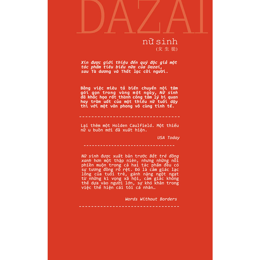 Như vậy là sau ba năm ròng rã đọc và dịch Dazai, chúng tôi đã giới thiệu đến quý độc giả những tác phẩm chính yếu, xuất sắc nhất của ông, cả tiểu thuyết và truyện ngắn. Chỉ riêng một số thư từ, vài truyện ngắn khác như “Kỷ niệm”, “Vợ của Villon” và vở kịch “Pháo hoa mùa đông” là chưa được dịch và giới thiệu. Hy vọng những tác phẩm đó sẽ được bổ sung đầy đủ khi ấn hành tuyển tập tác phẩm của Dazai trong tương lai.