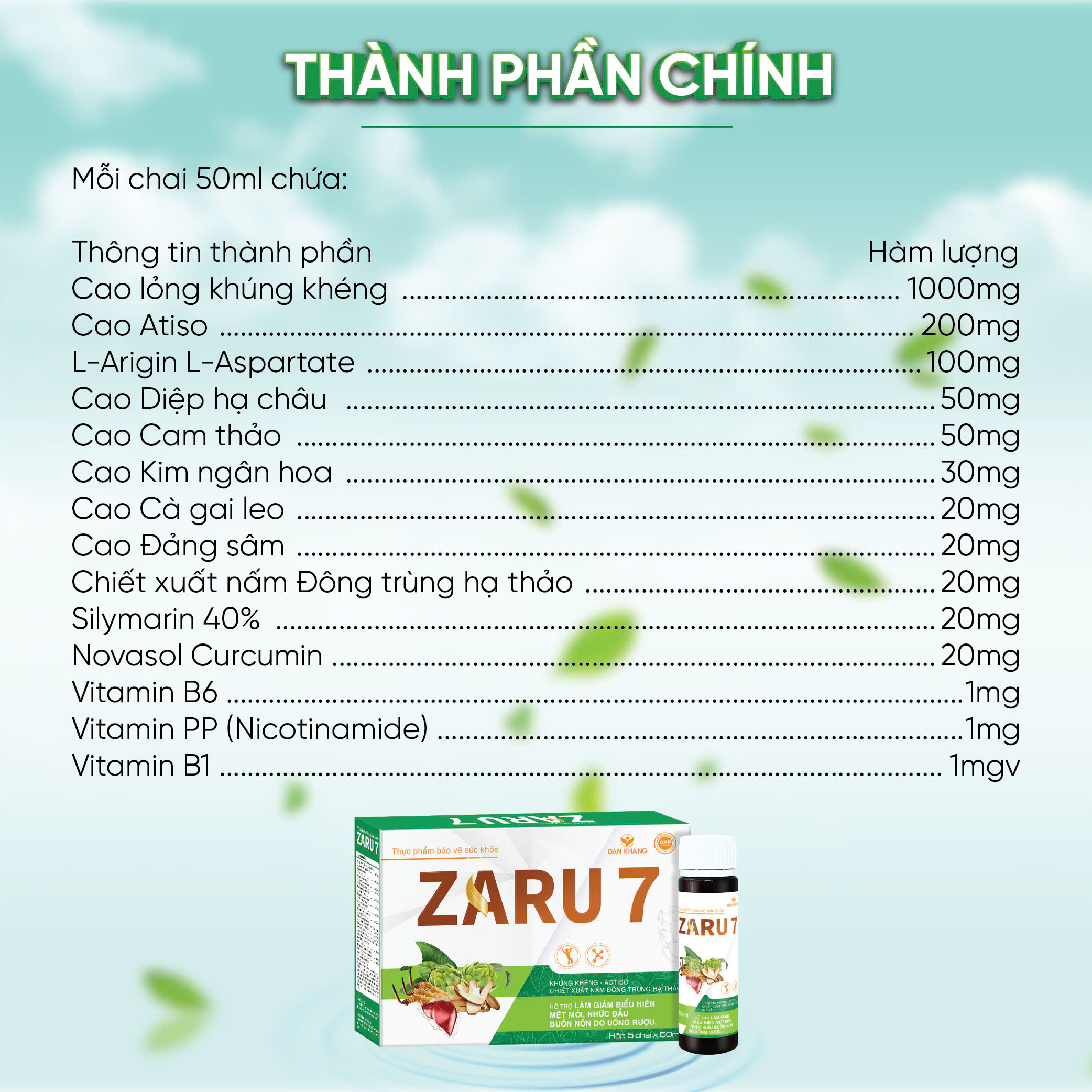 - Giúp giải độc gan Thành Phần Sản Phẩm: Trong 50 ml hỗn dịch có chứa: Cao lỏng Khúng khéng (Hovenia dulcis): 1000mg Cao Actiso (Cynara scolymus): 200mg L-Arginin L-Aspartate: 100mg Cao Diệp hạ châu (Phyllanthus urinaria): 50mg Cao Cam thảo (Glycyrrhiza uralensis): .... 50mg Cao Kim ngân hoa (Lonicera japonica): .. 30mg Cao Cà gai leo (Solanum procumbens): . 20mg Cao Đảng sâm (Codonopsis javanica): .. 20mg Chiết xuất nấm Đông trùng hạ thảo (Cordyceps militaris): .. 20mg Silymarin 40%: 20mg Novasol Curcumin (chứa oleoresin củ nghệ chiết xuất từ thân rễ củ nghệ (6%)): .. 20mg Vitamin B6 (Pyridoxine hydrochloride): ... 1mg Vitamin PP (Nicotinamide): . 1mg Vitamin B1 (Thiamin mononitrat): .. 1mg Tỷ lệ chiết cao = 1:10 Phụ liệu: Chất ổn định (xanthan gum), chất bảo quản (kali sorbat), chất tạo ngọt nhân tạo (sorbitol, acesulfame K), chất nhũ hóa (polysorbat 80, propylen glycol), chất điều chỉnh độ acid (acid citric, natri citrat), hương liệu thực phẩm tổng hợp (hương trái cây), nước tinh khiết. THÀNH PHẦN CHÍNH có trong ZARU 7:
