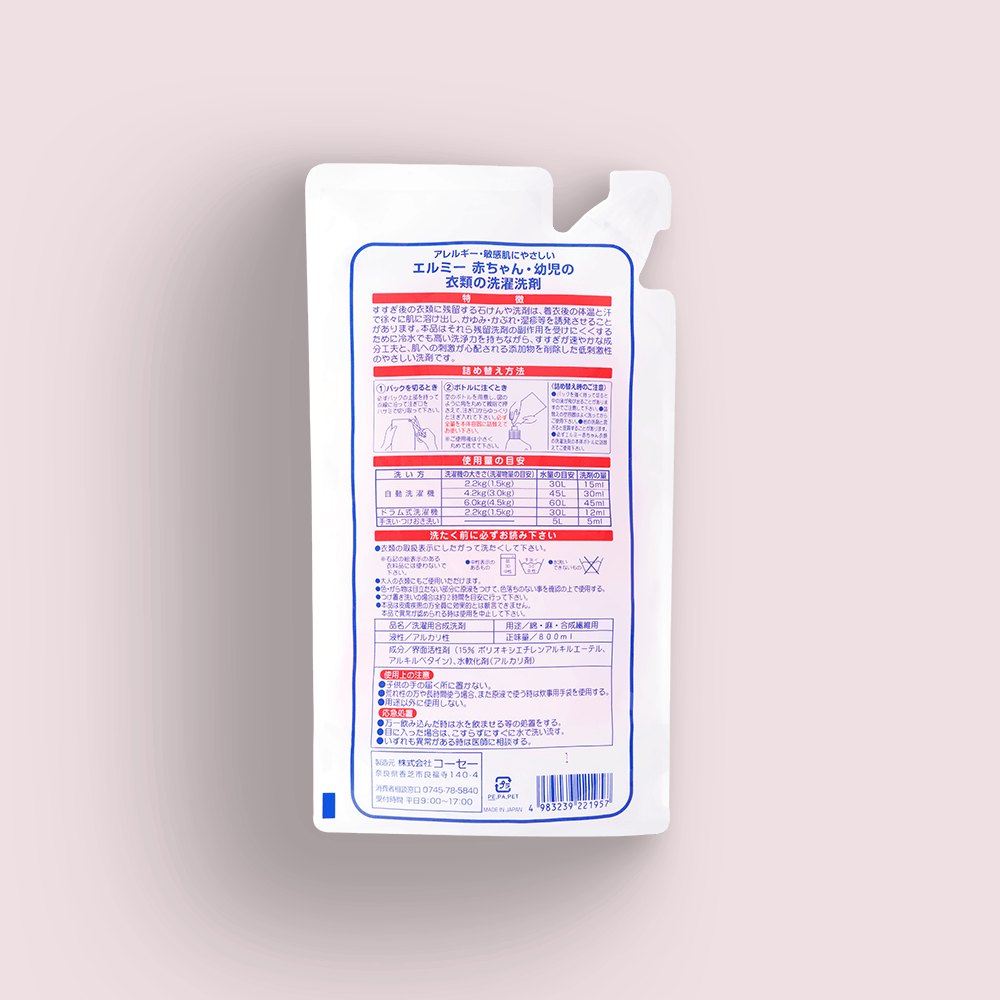 - Đặc điểm của Xà phòng và bột giặt thông thường khác là còn sót lại trên quần áo sau khi giặt sẽ dần dần hòa tan vào da do nhiệt độ cơ thể và mồ hôi sau khi mặc quần áo có thể gây ra tác hại chẳng hạn như : ngứa, phát ban và chàm. Để giảm tác dụng phụ của các chất tẩy rửa còn sót lại này, sản phẩm này là một chất tẩy rửa nhẹ, dịu nhẹ đã được tạo ra để ngăn chất tẩy rửa còn sót lại sau khi xả và loại bỏ các chất phụ gia khác nhau có thể gây kích ứng da. Lưu ý: