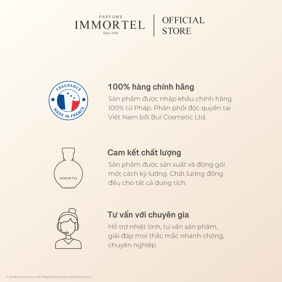 - Các sản phẩm nước hoa của IMMORTEL được chọn lọc kĩ từ những dòng nước hoa chất lượng tuyệt hảo nhất từ phòng thí nghiệm của IMMORTEL Paris, được nhập khẩu về Việt Nam từ đất nước Pháp, quê hương của nước hoa.