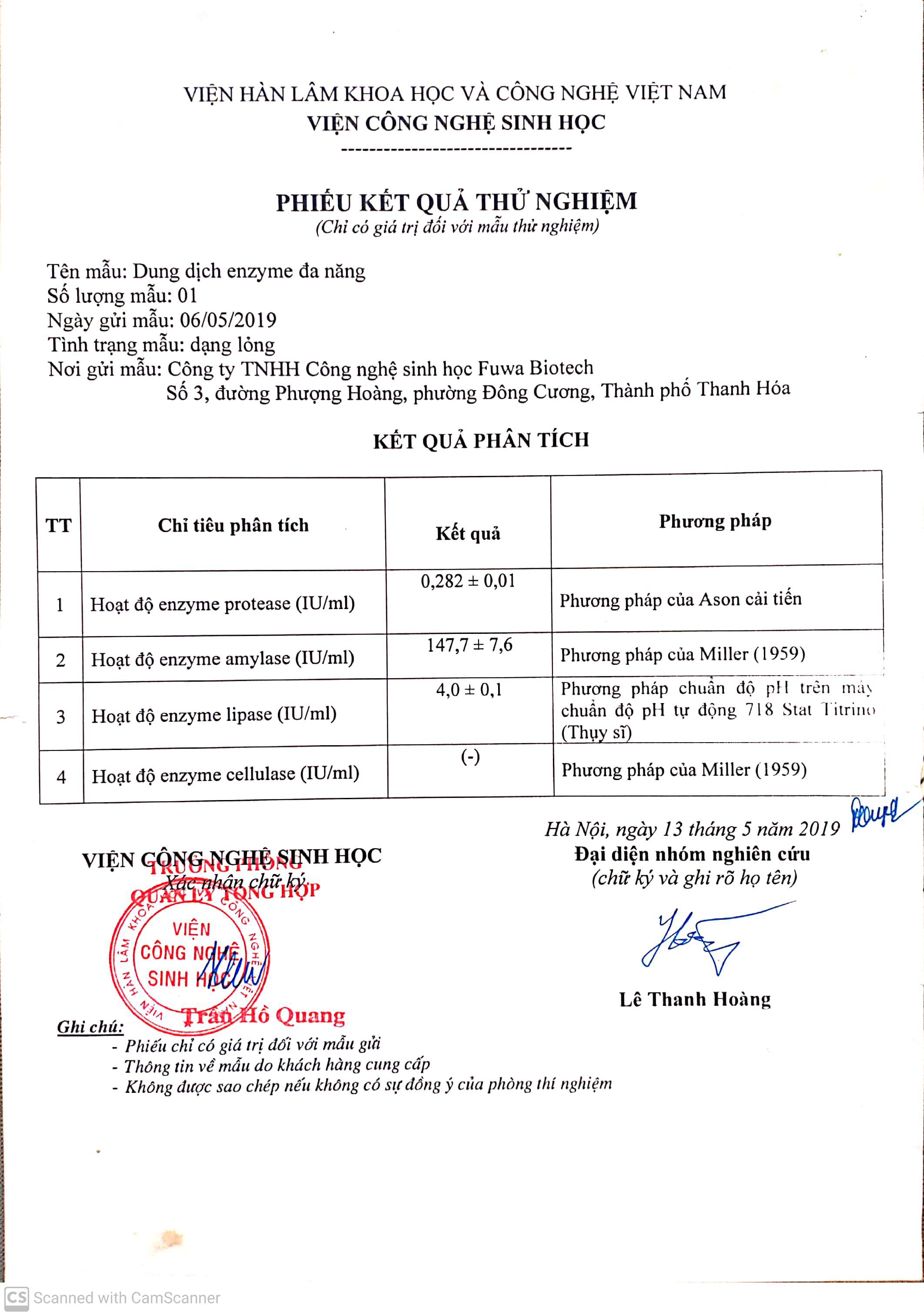 Độ an toàn của sản phẩm đã được thử nghiệm và chứng nhận an toàn bởi Viện Pasteur và đạt tiêu chuẩn chất lượng ISO 9001:2015 Cách dùng: Pha loãng theo tỷ lệ 50ml với 2 lít nước sạch để ngâm thực phẩm trong 30 phút. Rửa lại bằng nước sạch. Thành phần chính 100% Enzyme sinh học lên men từ dứa (Enzyme Amylase, Enzyme Lipase), Acid Lactic, Acid Acetic, Vitamin A, B1… Hương thơm: Không mùi Lưu ý: Sản phẩm lên men tự nhiên nên có mùi chua nhẹ, xuất hiện lắng cặn dưới đáy chai hoặc xuất hiện con men Scoby. HSD: 36 tháng Bảo quản: Để nơi khô thoáng, tránh ánh nắng trực tiếp và nhiệt độ < 45°C Dung tích: 1000ml / 100ml Xuất xứ: Việt Nam HSD: 36 tháng kể từ NSX, 06 tháng kể từ ngày mở nắp. Sản xuất bởi: CÔNG TY TNHH CÔNG NGHỆ SINH HỌC FUWA BIOTECH