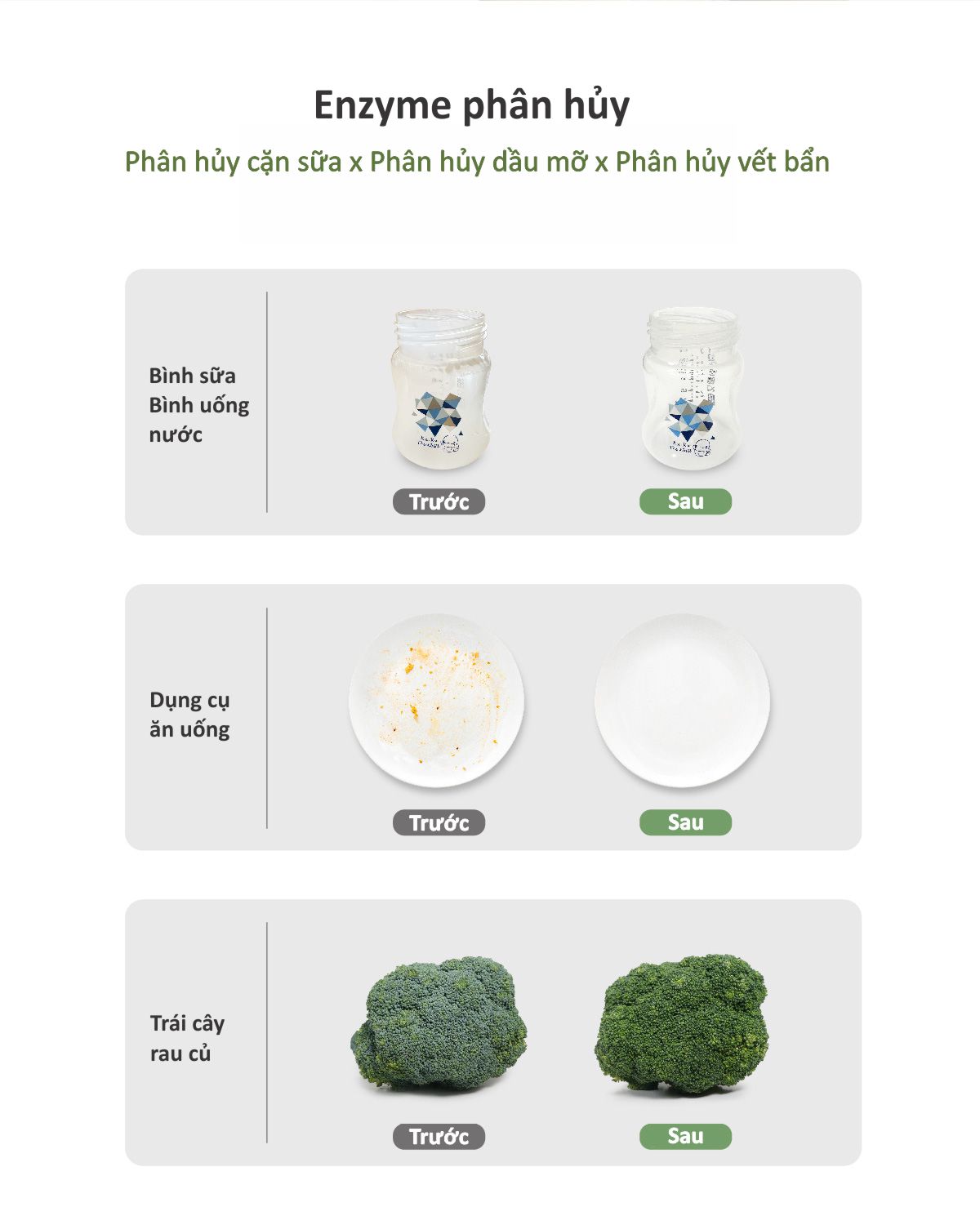 - Làm sạch chuyên sâu: Enzim phân hủy mạnh nhanh chóng phân hủy protein/ dầu mỡ, rửa sạch nhẹ nhàng không đóng cặn
