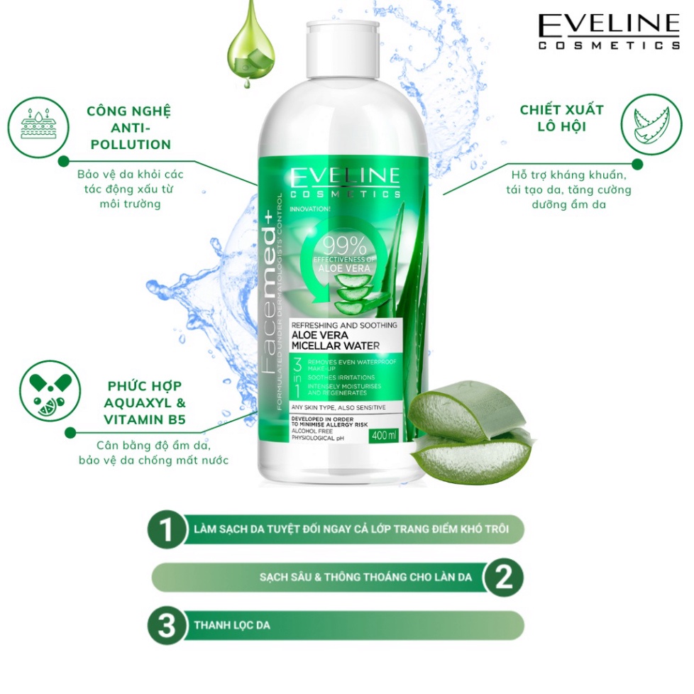 ✨Nước tẩy trang làm dịu mát da 3 trong 1 chiết xuất Lô hội Facemed Eveline 400ml