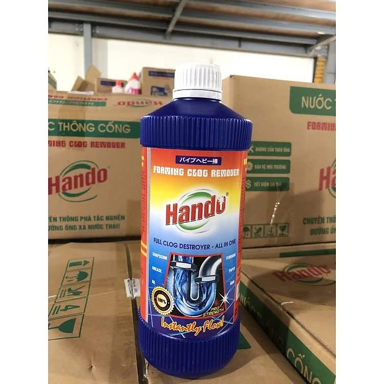 Thông sạch các cặn bẩn kẹt trong đường ốngNước thông tắc đường ống thoát nước Hando 1000ml xuất khẩugồm các hoạt chất đặc biệt có tác dụng làm mềm và phân huỷ các tạp chất