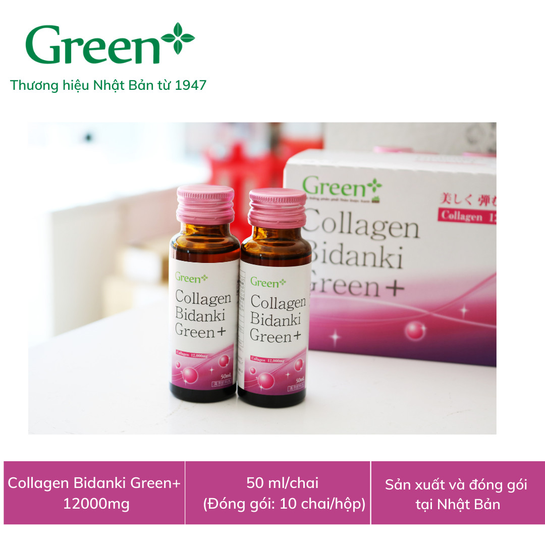 - Ngoài ra, chị em phụ nữ có thể tham khảo ý kiến chuyên gia khi cần thiết để đạt hiệu quả tối đa trong quá trình sử dụng collagen nước. Bảo quản: Nơi thoáng mát, tránh nơi có nhiệt độ cao và độ ẩm cao, tránh ánh sáng mặt trời chiếu trực tiếp. Chú ý: Thực phẩm này không phải là thuốc và không có tác dụng thay thế thuốc chữa bệnh. Không dùng cho người có mẫn cảm với bất kỳ thành phần nào của sản phẩm. Khối lượng tịnh: 50ml/ chai (± 7.5%) Xuất xứ: Nhật Bản Số ĐKSP: 5402/2018/ĐKSP. Công ty sản xuất: Yonedakeiteisya Co., Ltd Thương nhân nhập khẩu, phân phối và chịu trách nhiệm về chất lượng sản phẩm: CÔNG TY CỔ PHẦN TẬP ĐOÀN GREEN+ Video Lễ ra mắt sản phẩm Nước uống Collagen Bidanki Green+: Ngày 17/09/2022, Green+ vinh dự nhận Huy chương “Sản phẩm vàng vì sức khỏe cộng đồng năm 2022” do Hiệp hội Thực phẩm chức năng Việt Nam (VAFF) trao tặng. Giải thưởng “Sản phẩm vàng vì sức khỏe cộng đồng” là giải thưởng uy tín do Hiệp hội Thực phẩm chức năng Việt Nam tổ chức mỗi năm nhằm tôn vinh các sản phẩm bảo vệ sức khỏe và thực phẩm chức năng tốt, an toàn, hiệu quả được người tiêu dùng tín nhiệm. Giải thưởng “Sản phẩm vàng vì sức khỏe cộng đồng” đã được tổ chức 10 lần rất thành công; nhận được sự quan tâm của các doanh nghiệp sản xuất phân phối TPCN và người tiêu dùng trong cả nước. Từ đó khuyến khích các doanh nghiệp không ngừng nỗ lực để đưa ra các sản phẩm chăm sóc sức khỏe tốt nhất cho người dân Việt Nam. Người tiêu dùng Việt Nam cũng xem giải thưởng như một căn cứ để tìm kiếm & lựa chọn sản phẩm chăm sóc sức khỏe. Green+ rất vinh dự khi đạt giải “Sản phẩm vàng vì sức khỏe cộng đồng năm 2022” cho sản phẩm: Collagen Bidanki Green+ : Cung cấp tới 12.000mg collagen peptites mỗi ngày, giúp tái tạo và trẻ hóa làn da.