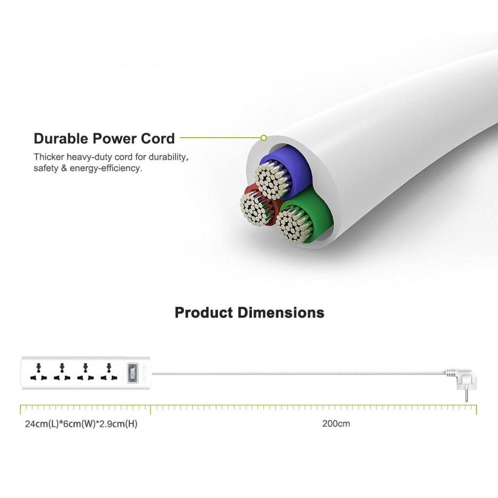 THÔNG SỐ KỸ THUẬT AC8 Moden : AC8 Chất liệu : vật liệu PC chống cháy Điện dòng:10A/250V Chị tải dòng : 2500w Thiết bị USB : + Type-C:30W(PD/QC/FCP/AFC); + USB-A 1:18W(QC/FCP/AFC); + USB-A 2/3:5V/3A;