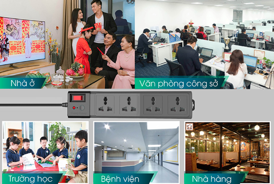 - Bảo vệ an toàn chống xung điện áp cao, xung sét. - Công tắc tích hợp rơ le chống quá tải 15A. - Ổ cắm đa năng sử dụng đồng chuyên dụng siêu đàn