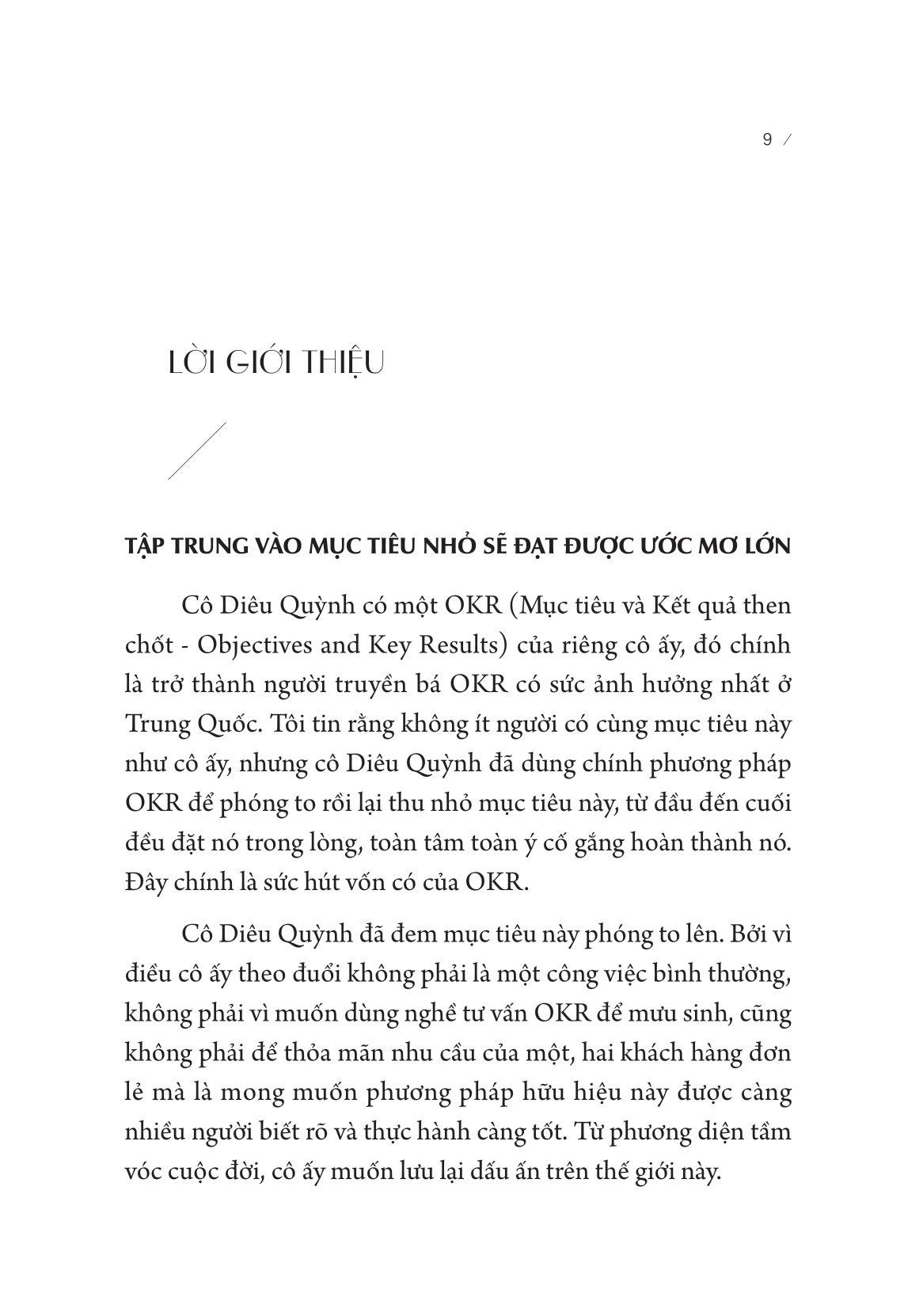 Cuốn sách được tác giả Diêu Quỳnh - Chuyên gia quản lí hiệu suất nhân sự người Trung Quốc, đã chắt lọc những gì tinh túy nhất của phương pháp OKR này, cũng như tìm ra nguyên tắc vận dụng và kết hợp nó với nhu cầu phát triển cá nhân của mỗi người.