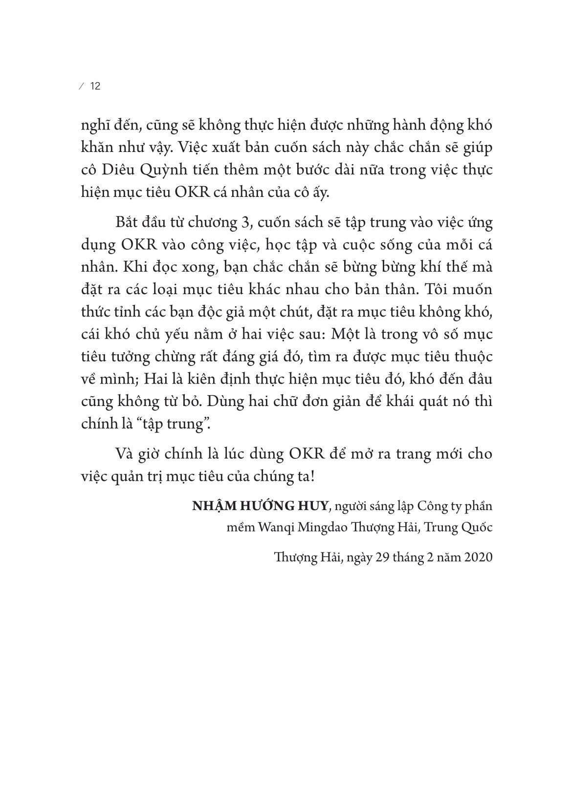 Hi vọng răng mọi người có thể dùng OKR để quản trị công việc và cuộc sống của bản thân. Tôi tin chắc bạn đọc có thể có được thu hoạch hữu ích sau khi đọc xong cuốn sách này, bởi vì OKR chính là phương pháp quản trị cuộc đời tuyệt diệu nhất.