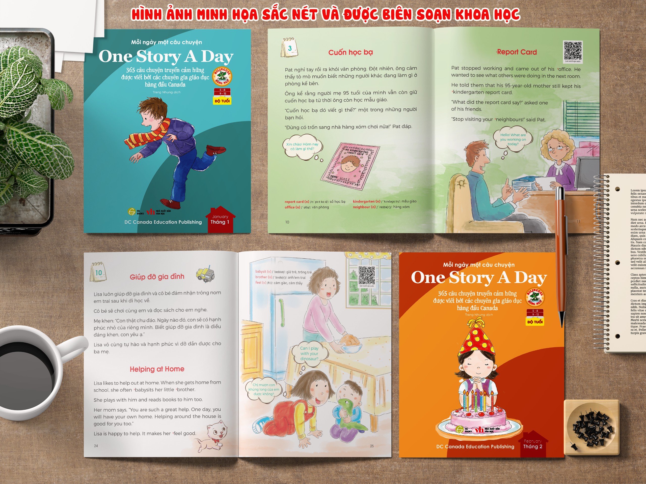 Đây được coi là “bộ sách mang lại lợi ích suốt đời cho người đọc”, một bộ sách lưu truyền qua thế hệ bởi nó được biên soạn bởi các chuyên gia giáo dục hàng đầu Canada. One Story a Day là 365 câu chuyện tương ứng với 365 ngày trong một năm về các chủ đề gần gũi trong cuộc sống hằng ngày, được kể lại một cách cực kỳ khoa học và sinh động. Lồng vào đó là lượng kiến thức khổng lồ dành cho các bạn nhỏ về tự nhiên, khoa học, lịch sử, trái đất, vũ trụ …