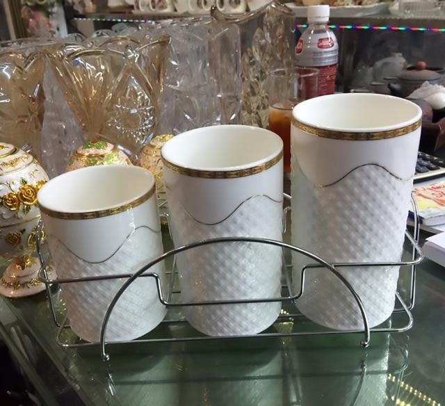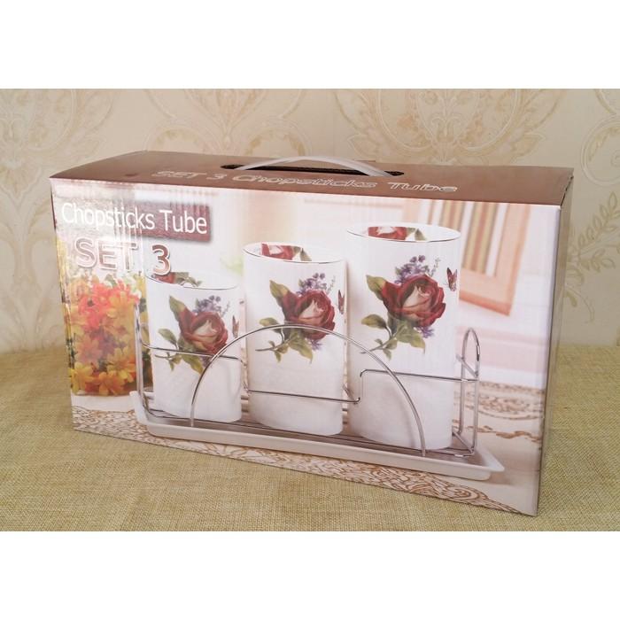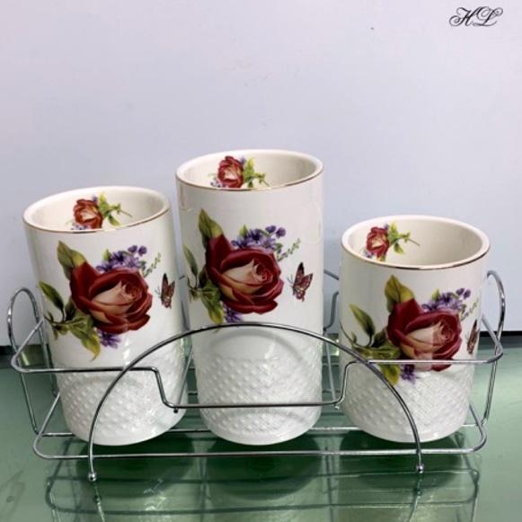 Bộ gồm 3 lọ sứ cao cấp Chất liệu: sứ cao cấp men bóng, bề mặt sần sang trọng Dùng để thìa, dĩa, đũ trên bàn ăn rất sang trọng Giá đỡ inox thuận tiện
