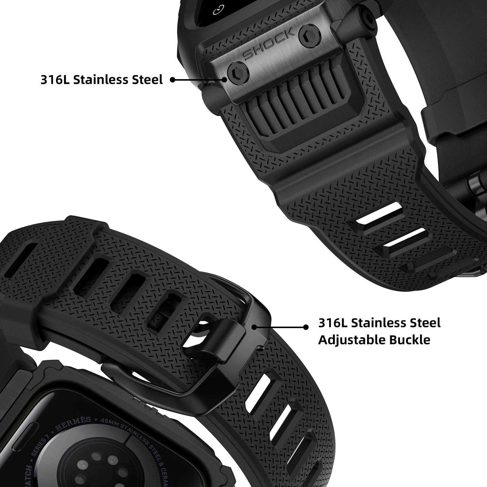 - Sản phẩm đúc nguyên khối, lỗ cắt chính xác không chi tiết thừa, vừa vặn cho Apple Watch Series 1/2/3/4/5/6/SE/7/8/9/SE2 Size 45mm/44mm/42mm