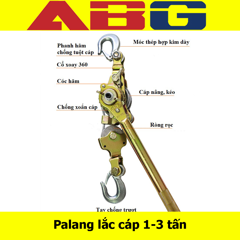 - Khả năng nâng hạ mạnh mẽ, nhanh chóng. Ứng dụng của Palang lắc cáp chính hãng 1 tấn - Palang quay tay - Palang - Palang lac cap Pa lăng cáp lắc tay hay palang lắc cáp ABG 1 tấn là dòng sản phẩm có thương hiệu ABG từ Việt Nam, được sản xuất nhằm mục đích sử dụng để nâng tải với chiều dài lớn, vị trí dùng khó khăn như đồi núi, vách núi, biển cần neo đậu, kéo. Bên cạnh đó Palang cáp lắc tay không thể thiếu công dụng là chuyên nâng hạ vật nặng. Ngoài ra, thiết bị này hay đi kèm và không thể thiếu khi kết hợp cùng các thiết bị nâng hạ như: cầu trục và cổng trục. Pa Lăng Lắc Cáp (Loại 1 Tấn), Palang Lac Cáp, Thiết Bị Dùng Để Kích Tăng ccáp Điện, Cáp Quang Và Viễn Thông - Pa lang có thiết kế gọn nhẹ, tiện dụng với dây cáp thay thế cho dây xích, để kéo theo phương dọc.