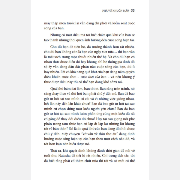 Và trong các mối quan hệ, chúng ta gần như chắc chắn nhận thấy rằng mình đang lặp lại những vết thương đã trải nghiệm từ lúc nhỏ, nhưng điều đó không có nghĩa là nhất thiết phải diễn ra như vậy. Nếu có thể dừng lại một chút để tìm hiểu những vết thương này đến từ đâu, chúng ta có thể thực hiện các bước để phá vỡ lập trình đã khiến bạn mắc kẹt trong hiện tại, từ đó cải thiện đáng kể các mối quan hệ và cuộc sống của bạn trong tương lai.