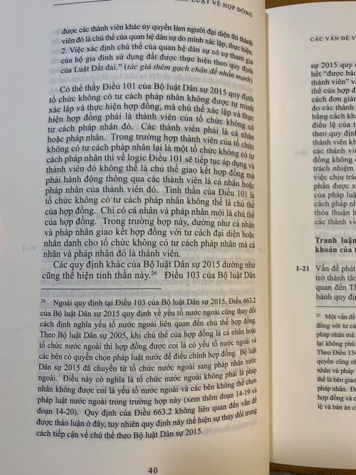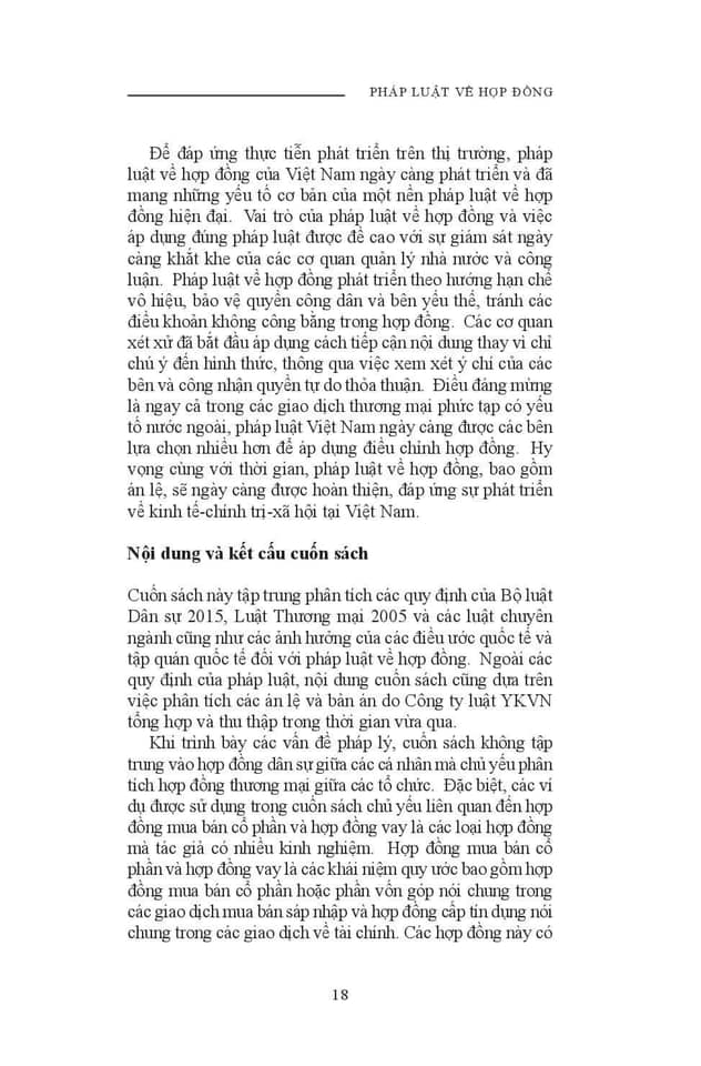 Xin giới thiệu với mọi người cuốn sách mới của Luật sư Trương Nhật Quang về pháp luật hợp đồng. Tác giả Trương Nhật Quang đã viết cuốn sách này trong 4 năm qua với sự hỗ trợ của nhiều đồng nghiệp và bạn bè. Trải dài trong gần 900 trang, cuốn sách phân tích các vấn đề pháp lý cơ bản liên quan đến (i) giao kết hợp đồng; (ii) hiệu lực hợp đồng; (iii) nội dung hợp đồng; (iv) vi phạm hợp đồng và biện pháp khắc phục; (v) miễn trừ trách nhiệm; (vi) chuyển giao quyền và nghĩa vụ; (vii) quyền của bên thứ ba trong hợp đồng vì lợi ích của bên thứ ba; và (viii) nguyên tắc chọn pháp luật áp dụng và cơ quan giải quyết tranh chấp hợp đồng. Có lẽ đây là cuốn sách đầu tiên nghiên cứu một cách có hệ thống các vấn đề pháp luật về hợp đồng của Việt Nam từ góc độ lý thuyết và thực tiễn, tập trung vào các giao dịch tài chính và mua bán doanh nghiệp có yếu tố nước ngoài. Ngoài việc phân tích các quy định của các văn bản pháp luật, cuốn sách cũng phân tích các án lệ và nhiều bản án, quyết định và phán quyết của tòa án và trọng tài mà Công ty luật YKVN đã sưu tầm trong thời gian qua. Cuốn sách được viết chủ yếu dành cho luật sư, người tham gia công tác giảng dạy và sinh viên luật mong muốn tìm hiểu các vấn đề pháp lý về hợp đồng. Đặc biệt, cuốn sách giúp các luật sư hành nghề có thể tham khảo khi tư vấn trong các giao dịch thương mại có yếu tố nước ngoài. Cuốn sách tập trung phân tích phạm vi mà các bên có thể thỏa thuận trong hợp đồng để phân bố rủi ro. Để giúp người đọc tiện tra cứu, cuốn sách có (i) bảng tra cứu từ khóa, (ii) bảng tra cứu án lệ, bản án và quyết định và (iii) danh sách các tài liệu trích dẫn.