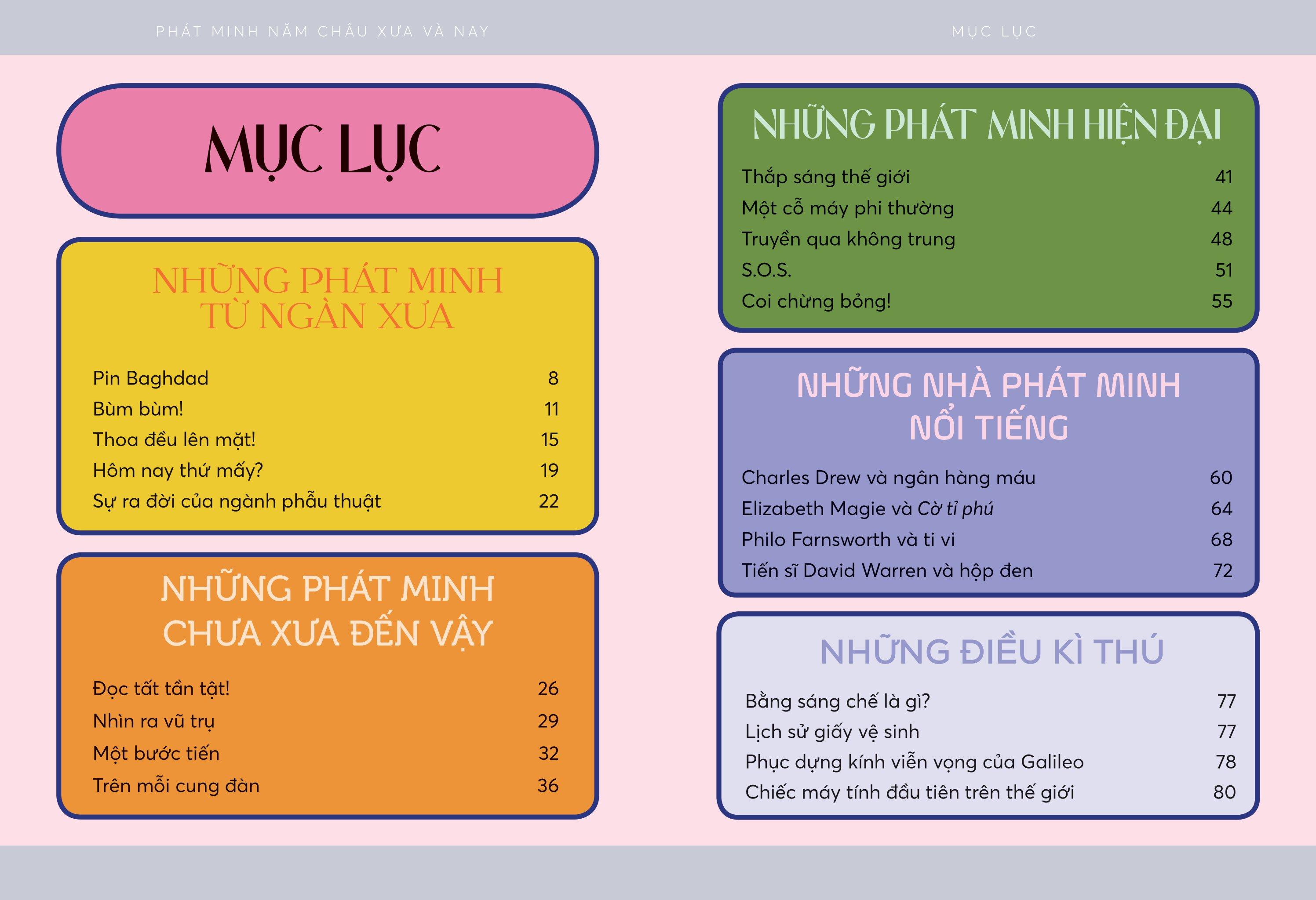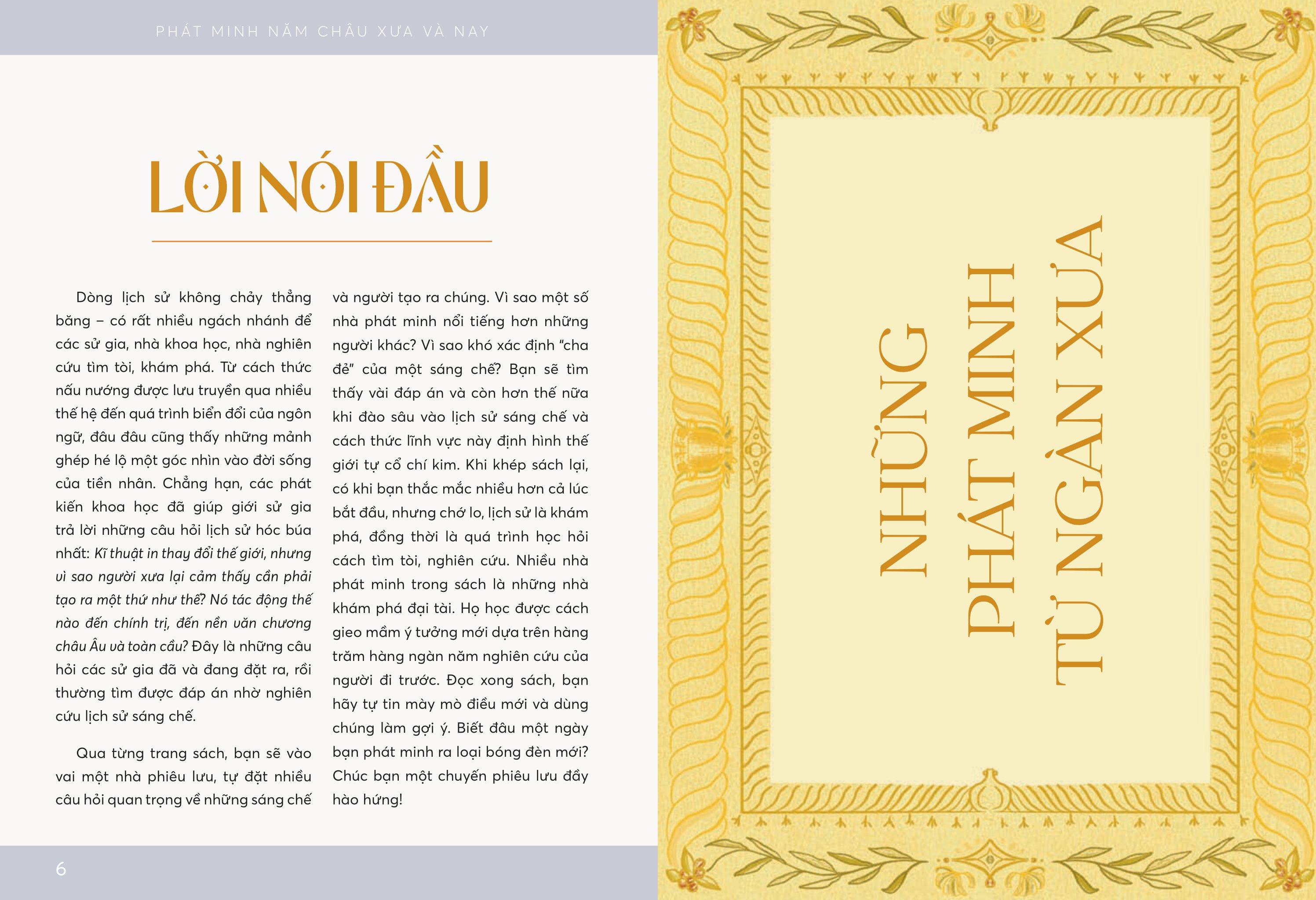 Phát Minh Năm Châu Xưa Và Nay Tại sao vài nhà phát minh nổi tiếng hơn những người khác? Vì đâu khó xác định “cha đẻ” của một sáng chế? Kĩ thuật in thay đổi thế giới, nhưng do nguyên cớ gì mà người xưa cảm thấy cần phải tạo ra nó? Khi đào sâu tìm hiểu lịch sử sáng chế và cách thức lĩnh vực này định hình thế giới tự cổ chí kim, bạn sẽ thấy đáp án cho những câu hỏi trên, và còn hơn thế nữa. Hãy vào vai một nhà phiêu lưu hiếu kì, lật mở những trang sách để khám phá nhiều chuyện hay ho về những sáng chế và người tạo ra chúng!