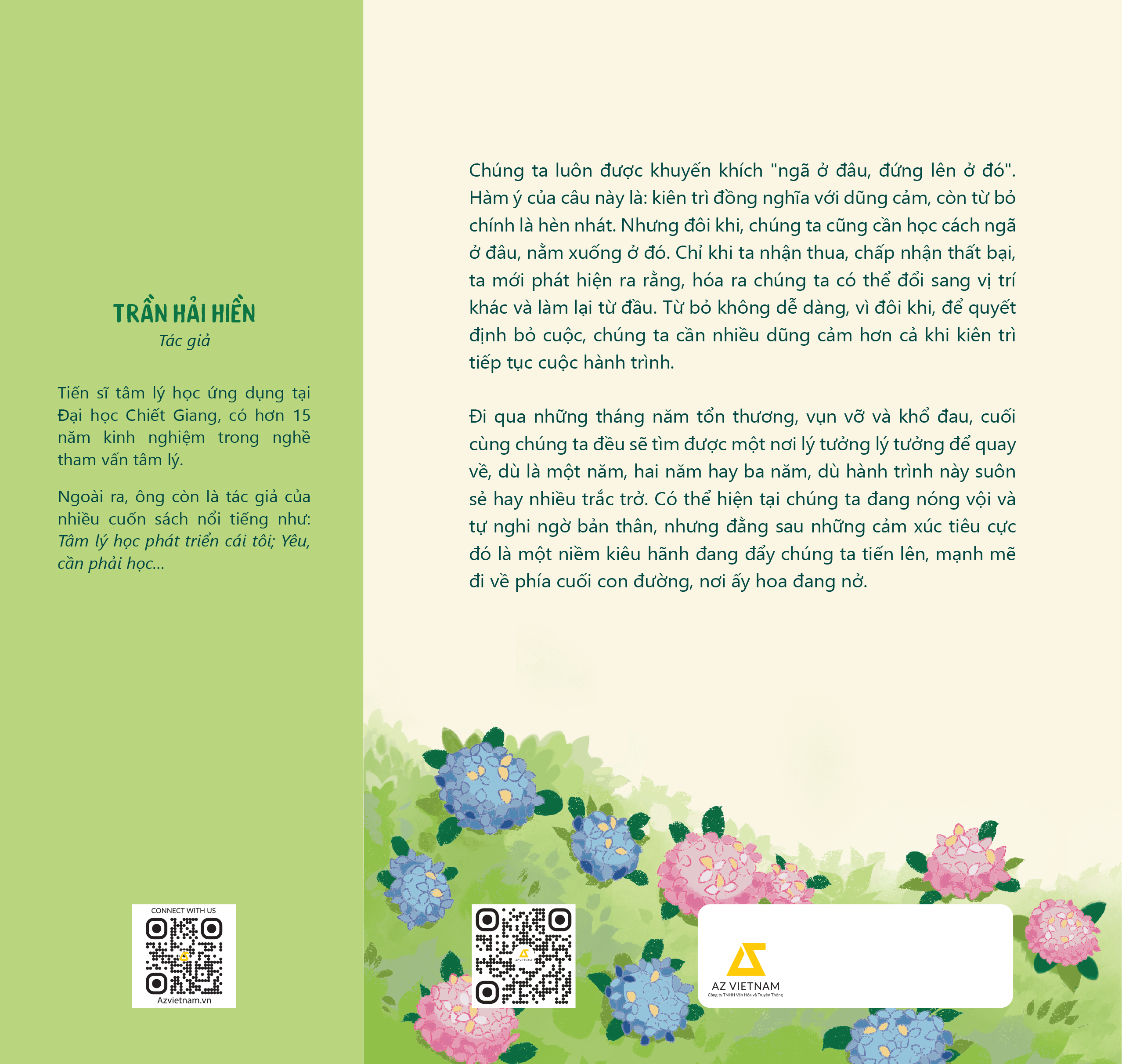 Đồng hành cùng bạn, "Phía cuối con đường, hoa đang nở" của tác giả Trần Hải Hiền sẽ trở thành tấm bản đồ hữu ích dẫn bạn đi tới đích mà bạn đang mong chờ, chỉ cần bạn đủ lòng kiên trì, nỗ lực từng bước vượt qua quãng thời gian khó khăn nhất, bạn sẽ tới được nơi bạn thực sự thuộc về.