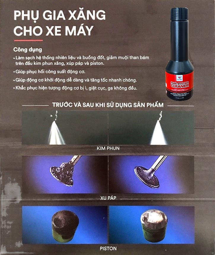 Công dụng - Làm sạch hệ thống nhiên liệu và buồng đốt.- Giảm muội than bám trên đầu kim phun xăng, xu páp và piston.- Giúp phục hồi công suất động cơ.- Giúp động cơ