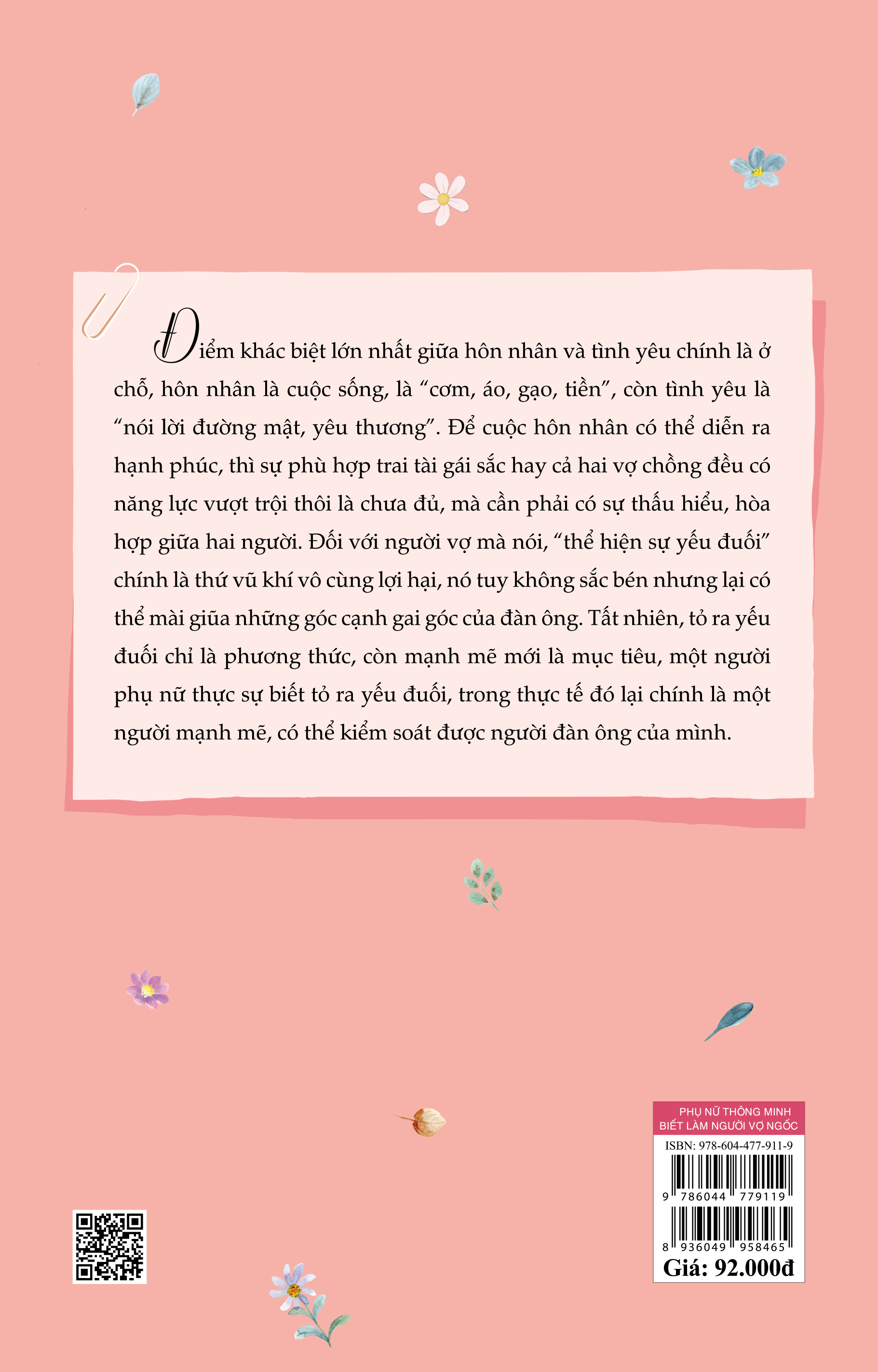 Điều khác biệt lớn nhất giữa hôn nhân và tình yêu chính là ở chỗ, hôn nhân là cuộc sống, là "cơm, áo, gạo, tiền", còn tình yêu là "nói lời đường mật, yêu thương". Để cuộc hôn nhân có thể diễn ra hạnh phúc, thì sự phù hợp trai tài gái sắc hay cả hai vợ chồng đều có năng lực vượt trội thôi là chưa đủ, mà cần phải có sự thấu hiểu, hòa hợp giữa hai người. Đối với người vợ mà nói, "thể hiện sự yếu đuối" chính là thứ vũ khí vô cùng lợi hại, nó tuy không sắc bén nhưng lại có thể mài giũa những góc cạnh gai góc của đàn ông. Tất nhiên, tỏ ra yếu đuối chỉ là phương thức, còn mạnh mẽ mới là mục tiêu, một người phụ nữ thực sự biết tỏ ra yếu đuối, trong thực tế đó lại chính là một người mạnh mẽ, có thể kiểm soát được người đàn ông của mình.