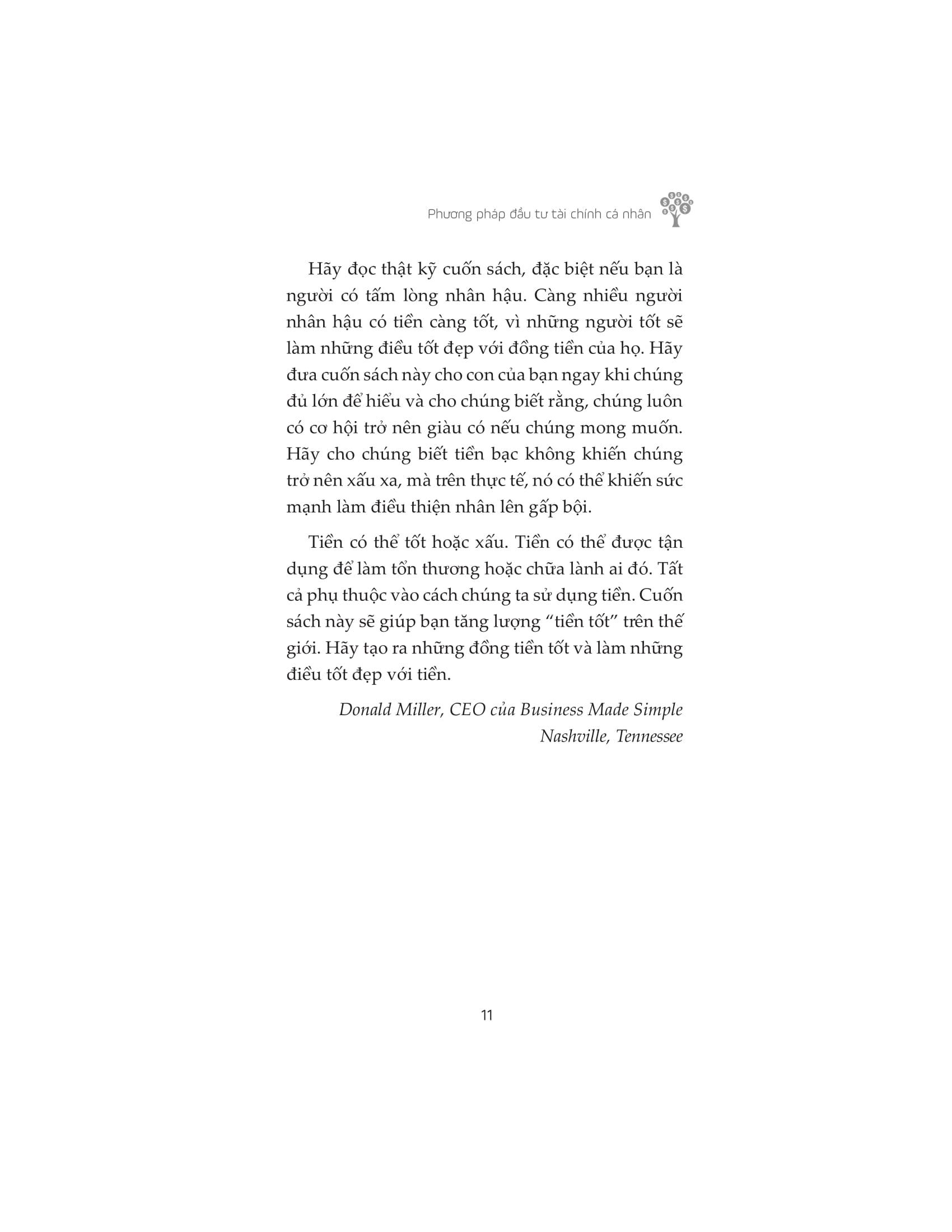 Vậy sẽ thế nào nếu bạn vừa kiếm được nhiều tiền hơn, vừa có một quỹ tiết kiệm lớn hơn, vừa xây dựng được những khoản đầu tư hiệu quả, đồng thời tạo ra những tác động tích cực cho thế giới và giúp ích cho hàng ngàn người khốn khổ khác? Đó là một ý tưởng tuyệt vời mà bạn hoàn toàn có thể thực hiện ngay hôm nay. Và “Phương pháp đầu tư tài chính cá nhân” sẽ giúp bạn làm điều đó.