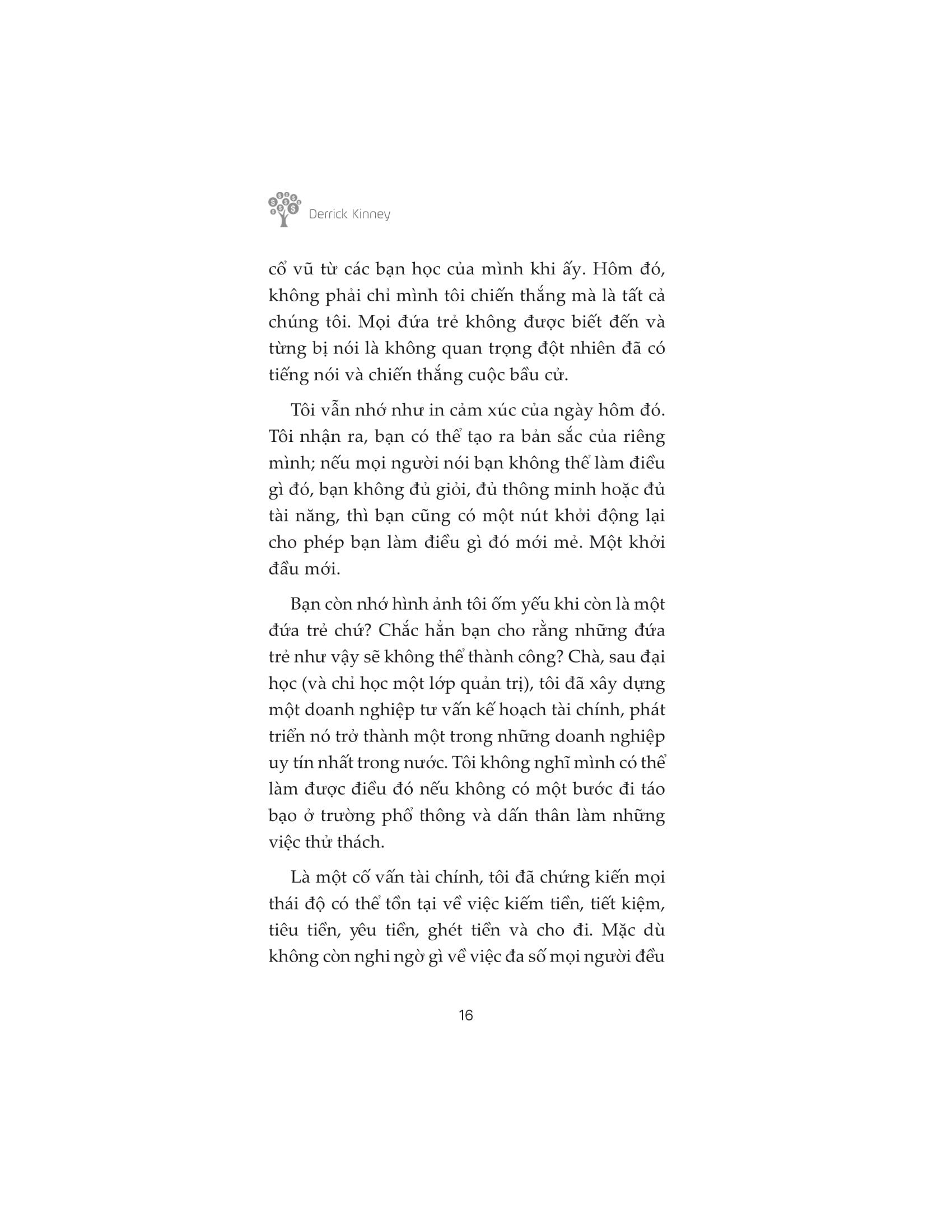 Cuốn sách được viết bởi cố vấn tài chính nổi tiếng, Derrick Kinney, sẽ giúp bạn học được cách kiếm nhiều tiền hơn – tiết kiệm nhiều hơn – trao đi nhiều hơn để tạo ra ý nghĩa lớn lao cho xã hội, bằng cách cung cấp một kế hoạch hành động cụ thể bao gồm: