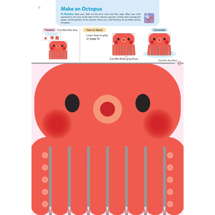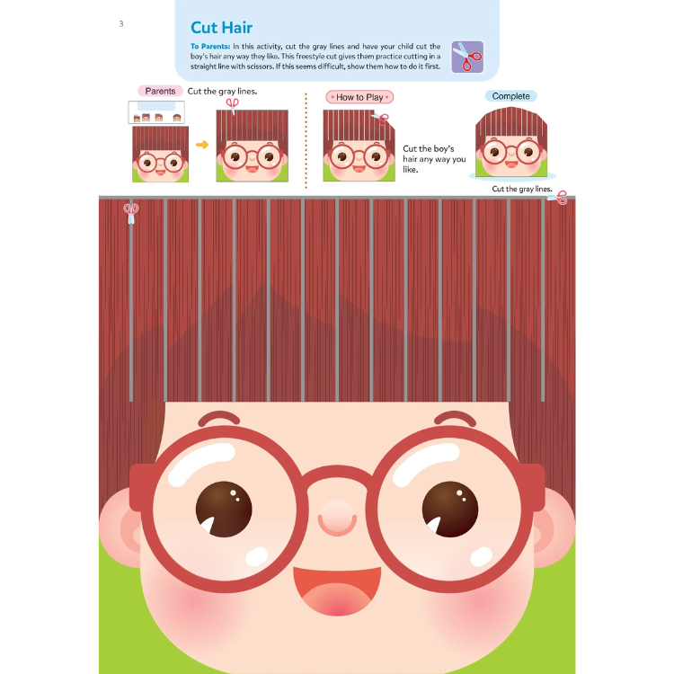 •  Play Smart Cutting and Pasting 3+ là một cuốn sách thiết kế cho trẻ em từ 3 tuổi trở lên, tập trung vào việc phát triển kỹ năng cắt, dán, và các hoạt động vận động tay nhỏ. Cuốn sách bao gồm nhiều trò chơi và thử thách hấp dẫn như cắt các đường và hình dạng, dán nhãn, sử dụng sticker, giải đố mê cung, và đếm. Những hoạt động này được thiết kế để giúp trẻ làm quen với các kỹ năng cắt kéo và củng cố kỹ năng vận động tinh, từ đó giúp trẻ trở nên tự tin và độc lập hơn khi chuẩn bị vào trường mẫu giáo.