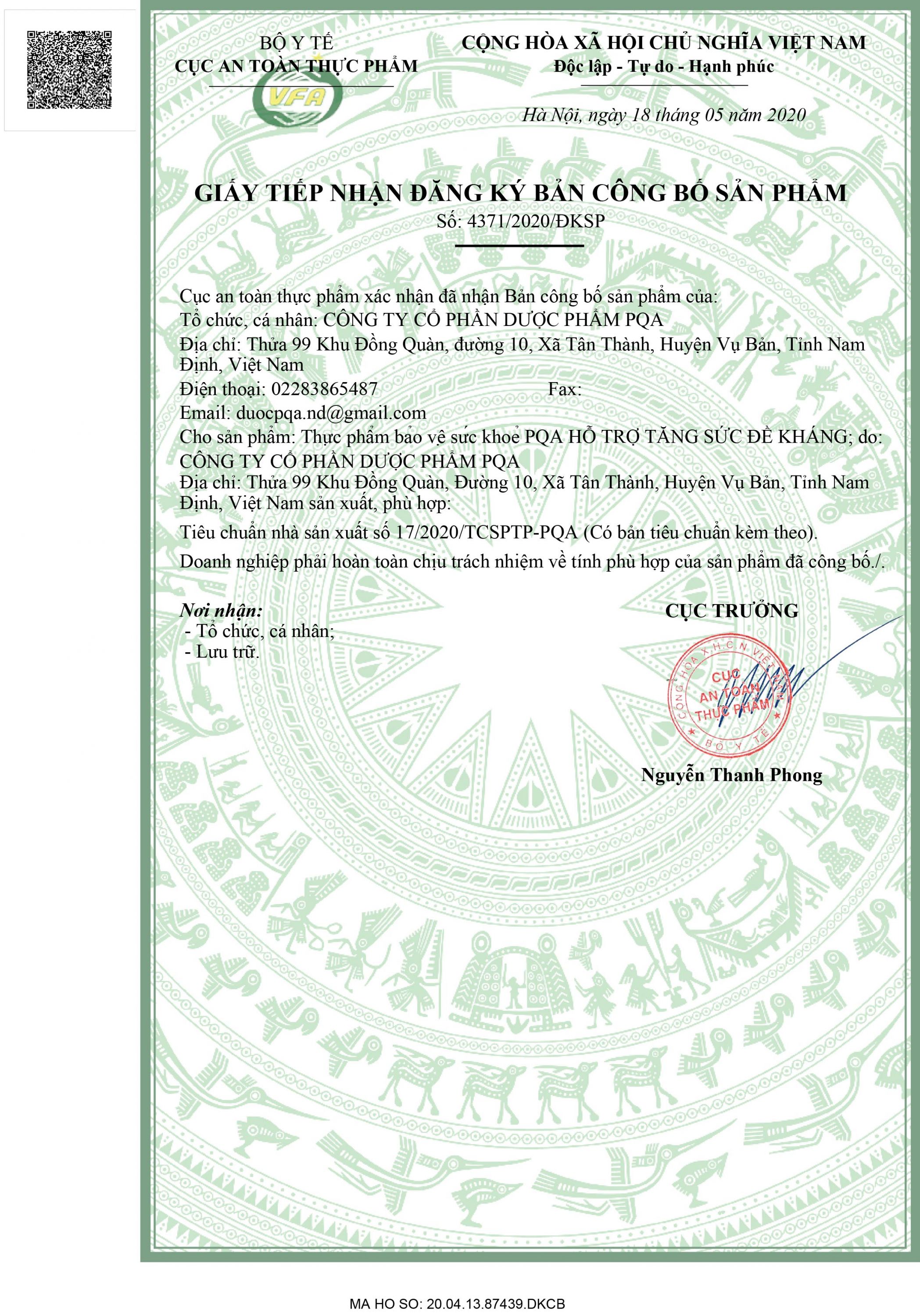 - Địa chỉ sản xuất: Công ty Cổ phần Dược phẩm PQA. Thửa 99, Khu Đồng Quàn, Xã Tân Thành, Huyện Vụ Bản, Tỉnh Nam Định. THÀNH PHẦN: