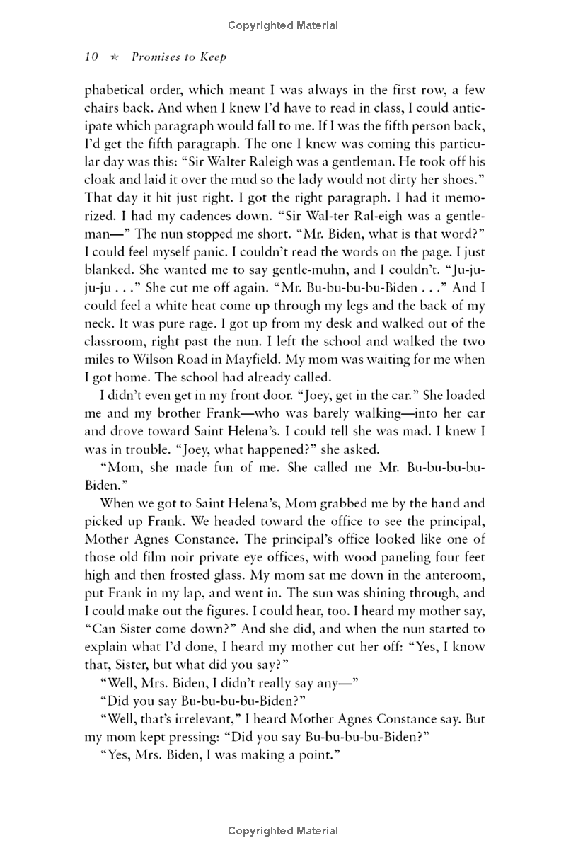 "Nearly forty years after I first got involved, I remain captivated by the possibilities of politics and public service. In fact, I believe that my chosen profession is a noble calling. That's why I wanted to be a part of it." -Joe Biden As a United States senator from Delaware since 1973, Joe Biden has been an intimate witness to the major events of the past four decades and a relentless actor in trying to shape recent American history. He has seen up close the tragic mistake of the Vietnam War, the Watergate and Iran-contra scandals, the fall of the Berlin Wall, the reunification of Germany, the disintegration of the Soviet Union, the aftermath of the 9/11 attacks, a presidential impeachment, a presidential resignation, and a presidential election decided by the Supreme Court. He's observed Nixon, Ford, Carter, Reagan, Clinton, and two Bushes wrestling with the presidency; he's traveled to war zones in Europe, the Middle East, and Africa and seen firsthand the devastation of genocide. He played a vital role by standing up to Ronald Reagan's effort to seat Judge Robert Bork on the Supreme Court, fighting for legislation that protects women against domestic violence, and galvanizing America's response (and the world's) to Slobodan Milosevic's genocidal march in the Balkans. In "Promises to Keep," Biden reveals what these experiences taught him about himself, his colleagues, and the institutions of government. With his customary candor, Biden movingly recounts growing up in a staunchly Catholic multigenerational household in Scranton, Pennsylvania, and Wilmington, Delaware; overcoming a demoralizing stutter; marriage, fatherhood, and the tragic death of his wife Neilia and infant daughter Naomi; remarriage and re-forming a family with his second wife, Jill; success and failure in the Senate and on the campaign trail; two life-threatening aneurysms; his relations with fellow lawmakers on both sides of the aisle; and his leadership of powerful Senate committees. Through these and other recollections, Biden shows us how the guiding principles he learned early in life-the obligation to work to make people's lives better, to honor family and faith, to get up and do the right thing no matter how hard you've been knocked down, to be honest and straightforward, and, above all, to keep your promises-are the foundations on which he has based his life's work as husband, father, and public servant. "Promises to Keep" is the story of a man who faced down personal challenges and tragedy to become one of our most effective leaders. It is also an intimate series of reflections from a public servant who refuses to be cynical about political leadership, and a testament to the promise of the United States. "From the Hardcover edition."