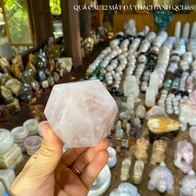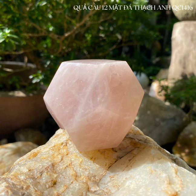 "Bỏ túi" năng lượng yêu thương và an lành với viên đá thạch anh hồng 12 mặt QC1409. Đường kính 8cm, nặng 520gr, chế tác tinh xảo. Biểu tượng của tình duyên, chữa lành và sự