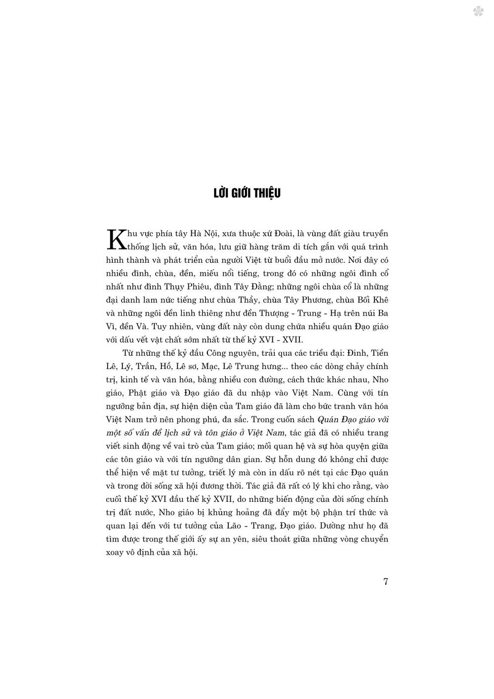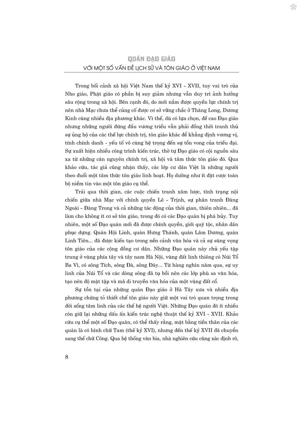 Để giúp độc giả có thêm tài liệu tham khảo, nghiên cứu về Đạo giáo ở Việt Nam, đặc biệt là nghiên cứu về các quán Đạo giáo, Nhà xuất bản Chính trị quốc gia Sự thật xuất bản cuốn sách Quán Đạo giáo với một số vấn đề lịch sử và tôn giáo ở Việt Nam do TS. Nguyễn Thế Hùng biên soạn. Cuốn sách gồm 4 chương, trình bày một số vấn đề chung về Đạo giáo và quá trình du nhập của Đạo giáo vào Việt Nam, những nghiên cứu về các quán Đạo giáo qua khảo sát các quán Đạo ở khu vực phía tây Hà Nội, thể hiện đặc trưng về kiến trúc, hiện vật tiêu biểu có trong các quán Đạo giáo; quán Đạo giáo ở khu vực phía tây Hà Nội và một số vấn đề về lịch sử và tôn giáo...