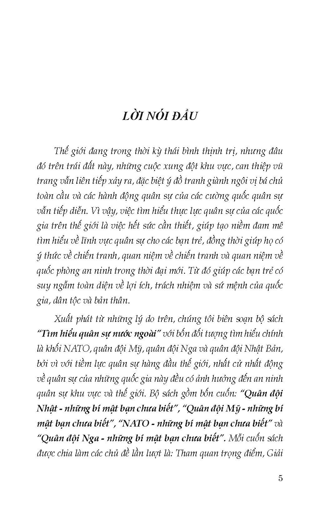 Bộ sách gồm bốn cuốn: “Quân đội Mỹ - những bí mật bạn chưa biết”, “NATO - những bí mật bạn chưa biết”, “Quân đội Nga - những bí mật bạn chưa biết” và “Quân đội Nhật - những bí mật bạn chưa biết”.