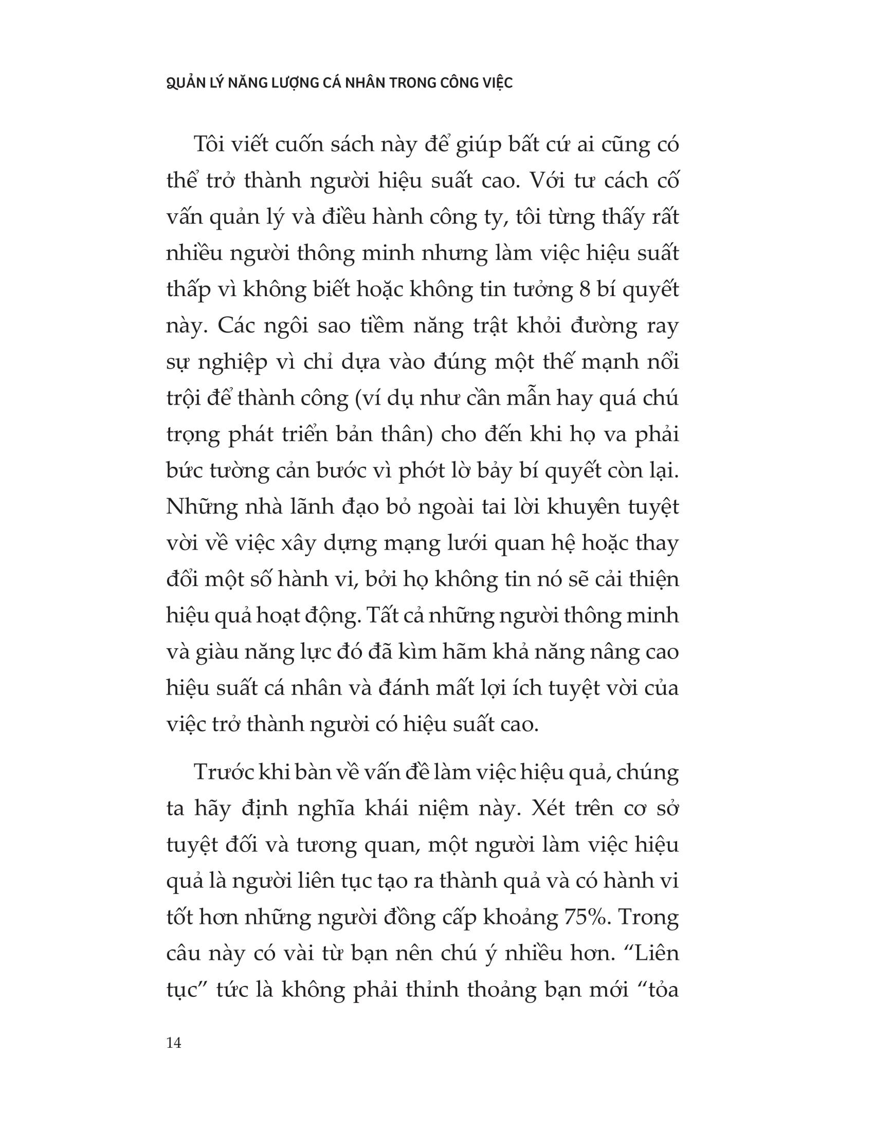 Trong cuốn sách này, Marc Effron - chuyên gia về quản lý tài năng và tác giả sác bán chạy, với cách tiếp cận đặc trưng vô cùng đơn giản lấy khoa học làm nền tảng, xác định những yếu tố quan trọng nhất và chỉ cho chúng ta thấy làm thế nào để tận dụng tối ưu thời gian và năng lượng cá nhân để cải thiện và đẩy bật hiệu suất. Rõ ràng hiệu suất cao là kết quả cuối cùng từ tổng hợp nhiều yếu tố, và một vài yếu tố trong đó nằm ngoài khả năng kiểm soát hay thay đổi của chúng ta. Effon chỉ ra 8 yếu tố và từ đó khuyến khích chúng ta tạo thành 8 thói quen để kiểm soát và thực hành những phương pháp thực tế và hữu dụng để chúng ta có cải thiện những yếu tố nằm trong khả năng kiểm soát của chúng ta.