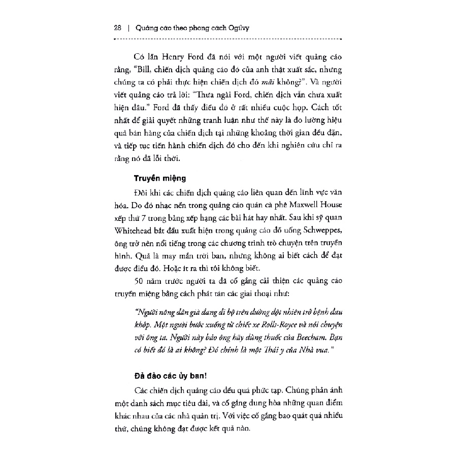 Ogilvy on advertising là sách về marketing không dành cho những độc giả nghĩ rằng họ đã biết hết về quảng cáo mà dành cho những triển vọng trẻ – và những người đã có kinh nghiệm nhưng vẫn không ngừng tìm cách để cải thiện thành công trong nghề. Đây là cuốn sách vỡ lòng thẳng thắn, chân thực và không thể thiếu được đối với bất kỳ người làm quảng cáo nào.
