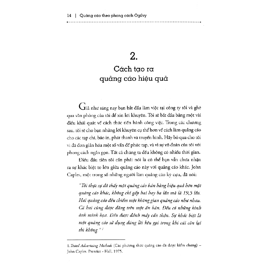 David Ogilvy là một trong những gương mặt nổi bật nhất của ngành quảng cáo, với danh xưng “Cha đẻ của nền quảng cáo hiện đại”. Các cuốn sách ông viết về nghệ thuật quảng cáo đều là những cuốn cẩm nang gối đầu giường của những người trong ngành, từ các vị giáo sư giảng dạy tại đại học đến những người thực sự lăn lộn tiếp xúc với khách hàng thường ngày. Họ gần như thuộc lòng những nguyên tắc và bí quyết của ông, đồng thời coi đó như kim chỉ nam trong nghề của mình.