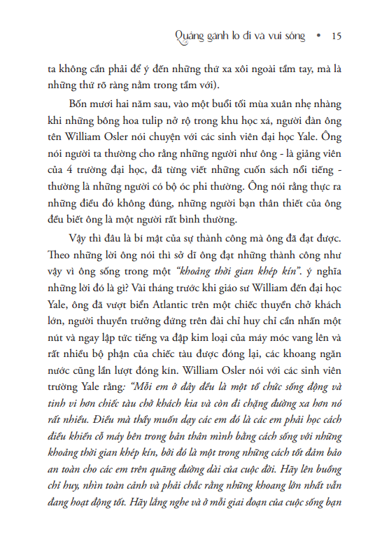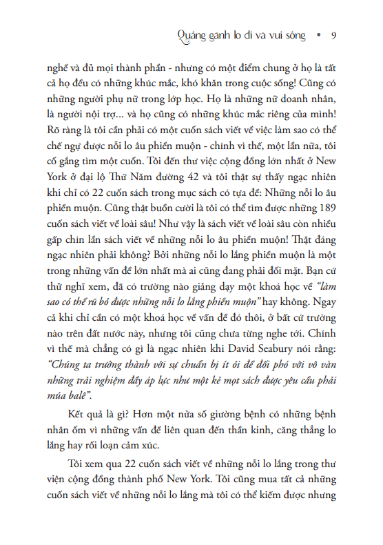 Bất kỳ ai đang sống đều sẽ có những lo lắng thường trực về học hành, công việc, những hoá đơn, chuyện nhà cửa, Cuộc sống không dễ dàng giải thoát bạn khỏi căng thẳng, ngược lại, nếu quá lo lắng, bạn có thể mắc bệnh trầm cảm. Quẳng Gánh Lo Đi Và Vui Sống khuyên bạn hãy khóa chặt dĩ vãng và tương lai lại để sống trong cái phòng kín mít của ngày hôm nay.