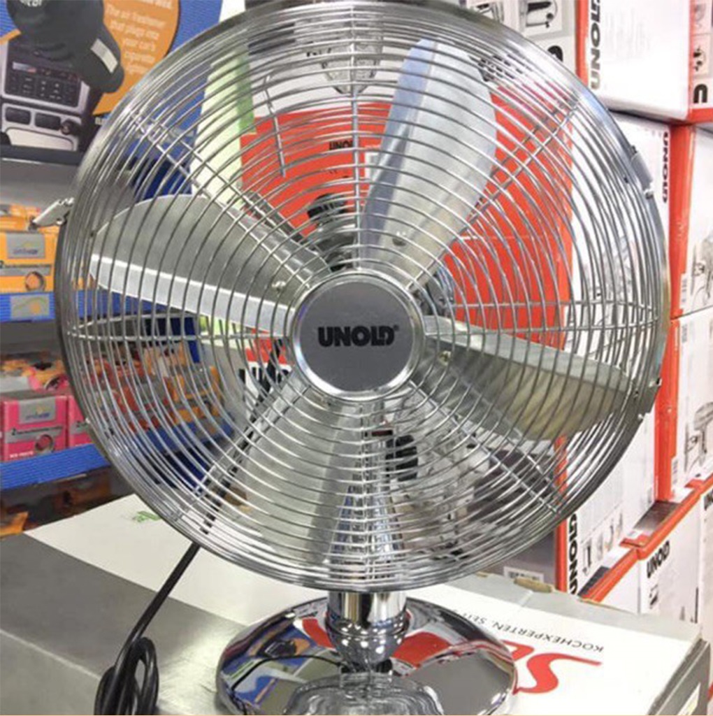 - Được đánh bóng cao và sáng bóng, Quạt bàn Unold có kiểu dáng retro hợp thời trang cho làn gió mới trên bàn làm việc của bạn, tại hội nghị hoặc trong nhà kính! Với điều khiển tốc độ ba giai đoạn, dao động có thể chuyển đổi và góc nghiêng có thể điều chỉnh, Climate Assistant sành điệu và nhỏ gọn có tất cả các tính năng hữu ích có thể mang theo bất cứ nơi nào bằng tay cầm thực tế trên vỏ và với một sợi cáp dài 175 cm, nơi cần có một luồng gió mới.