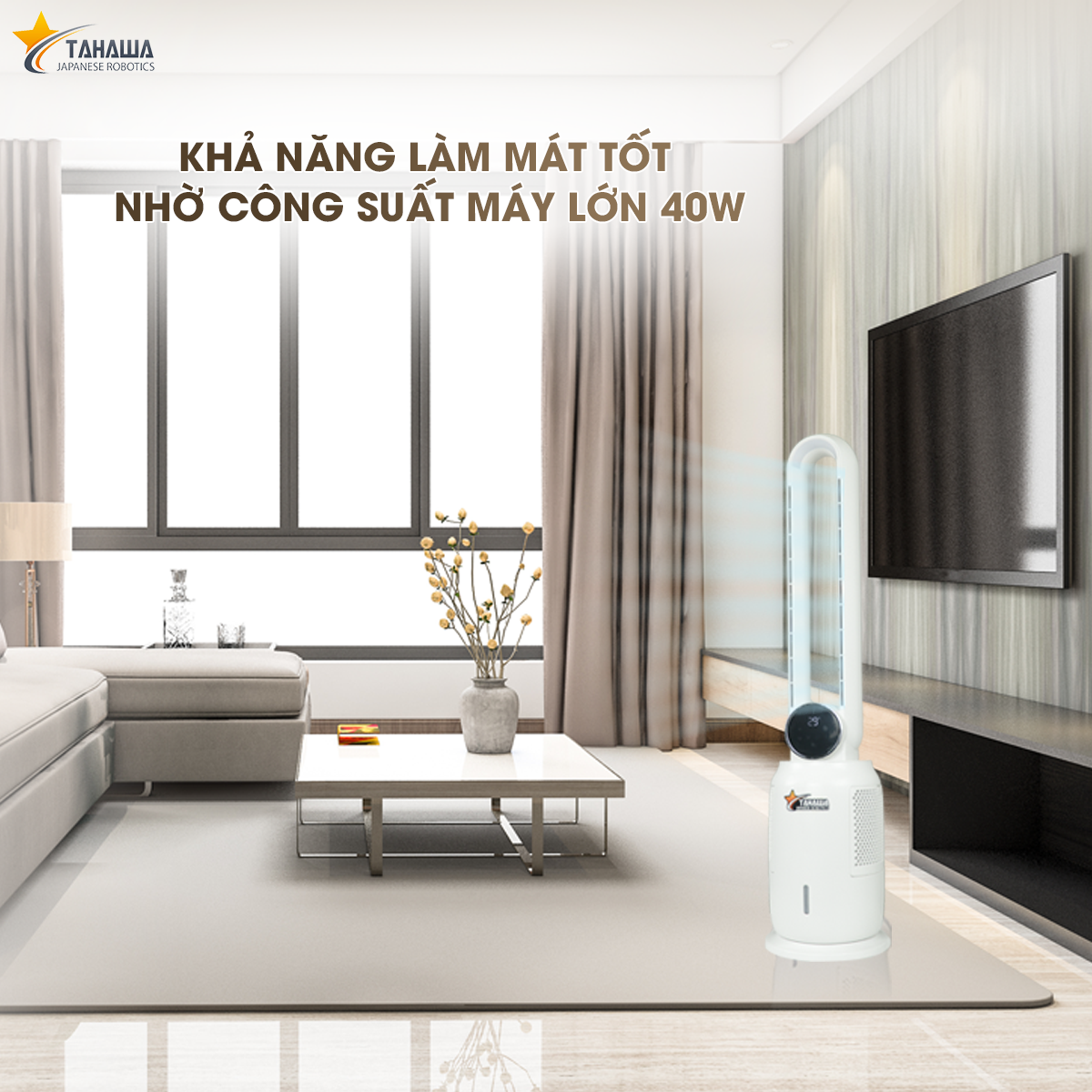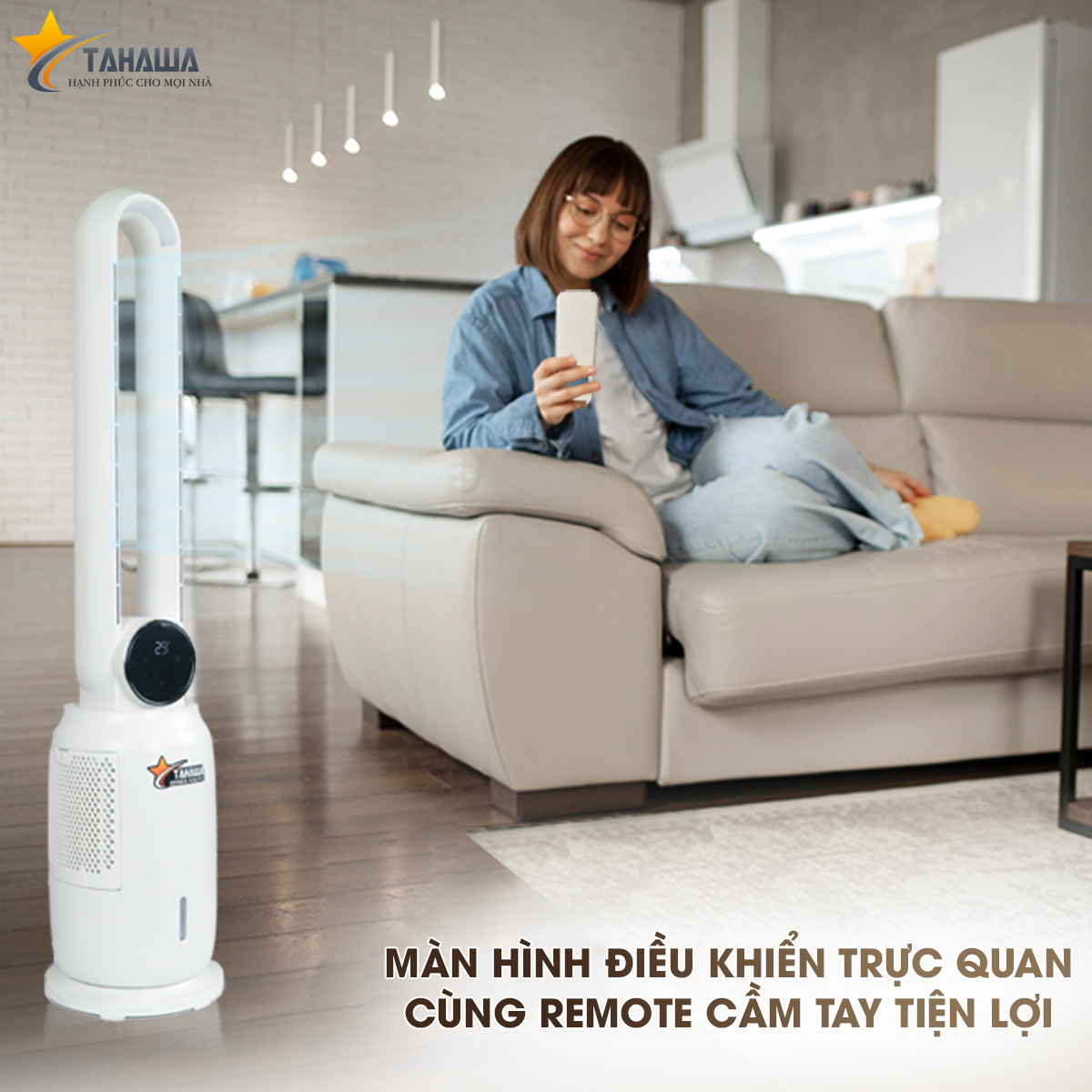 - Màn hình điều khiển trực quan cùng remote cầm tay tiện lợi Quạt không cánh Tahawa TH-A4 Pro sở hữu thiết kế hiện đại và an toàn Khác với những chiếc quạt truyền thống thông thường, Quạt không cánh Tahawa TH-A4 Pro sở hữu thiết kế độc đáo mang phong cách hiện đại, thiết kế không cánh bắt mắt tạo điểm nhấn cho không gian. Với kiểu dáng trụ đứng nhỏ gọn đơn giản, tiết kiệm không gian nhưng lại vô cùng sang trọng. Hơn nữa, thiết kế hoàn toàn không cánh của quạt có thể chạm bất cứ vị trí nào trên máy đảm bảo độ an toàn cho trẻ nhỏ và gia đình bạn. Quạt điện không cánh Tahawa TH-A4 Pro gồm 2 bộ phận chính là đế quạt và vành khuyên: • Đế quạt: gồm động cơ làm mát hình sóng sin 360 độ có chứa cánh quạt, được bố trí ở bên trong đế quạt chứ không thiết kế ở bên ngoài như các loại quạt truyền thống khác. • Vành khuyên: Khu vực tỏa ra luồng gió được thiết kế dưới dạng bầu dục. Thiết kế ống gió độc đáo cùng với sự kết hợp của công nghệ ACM (Air Certification & Multiplication) và khả năng cung cấp tới 750L không khí mỗi giây, Quạt không cánh Tahawa TH-A4 Pro tạo luồng gió rộng, mềm mại và giống với gió tự nhiên. Từ đó mang đến cảm giác dễ chịu, thư thái hơn cho người dùng, hạn chế các triệu chứng khó chịu như nhức đầu hay mệt mỏi thường gặp khi sử dụng các loại quạt khác. Khả năng làm mát tốt nhờ công suất máy lớn Khoảng cách cấp gió của Quạt không cánh Tahawa TH-A4 Pro có thể lên đến 10m. Quạt cây không cánh có khả năng cấp gió và làm mát diện rộng cho không gian căn phòng khách khoảng 30m2 với hiệu suất làm mới không khí 25 lần/giờ. Đặc biệt, quạt có thể dùng chung khi bật điều hòa cho hơi lạnh lưu thông nhanh hơn, giúp nhiệt độ phòng được cân bằng và làm mát đồng đều cho cả ngôi nhà. Lọc không khí hiệu quả nhờ bộ lọc thế hệ mới Quạt không cánh Tahawa TH-A4 Pro tạo ion âm khử mùi, bộ lọc Hepa thanh lọc không khí, bộ lọc Carbon khử mùi, đèn UV diệt khuẩn giúp không khí trong lành, an toàn, hiệu quả. Không chỉ làm mát, tạo gió mềm mại, tự nhiên mà quạt không cánh Tahawa TH-A4 Pro còn có khả năng thanh lọc không khí vô cùng hiệu quả thông qua bộ lọc Hepa 13 lớp lọc hạt vật chất cùng với việc bổ sung ion âm trong không khí. Các ion âm giúp khử mùi, hút sạch khói, khí độc hại, kết hợp với 1 bộ lọc than hoạt tính và 1 bộ lọc HEPA giúp lọc mọi bụi mịn, bụi thô, lông thú cưng, vi khuẩn nấm hay một số loại chất gây dị ứng cho cơ thể. Từ đó cải thiện không khí trong phòng, mang đến sự trong lành, dễ chịu, góp phần bảo vệ sức khỏe cho người dùng. Bù ẩm bằng hơi nước hiệu quả Quạt Không Cánh Tahawa TH- A4 Pro có khả năng bù ẩm bằng hơi nước hiệu quả, rất thích hợp sử dụng trong điều kiện thời tiết hanh khô, hoặc làm mát không khí tức thì. Với khay nước có dung tích lên đến 2 lít giúp cùng hệ thống bơm điện tử giúp quạt làm mát tốt hơn mà không tốn nhiều nước. Ngoài ra, bạn có thể bỏ thêm đá, đá khô vào khay nước để quạt làm mát tốt hơn. Góc gió rộng tùy chỉnh được tới 120 độ Quạt Tahawa TH-A4 Pro có thể tùy chỉnh góc gió phù hợp với nhu cầu với 3 góc độ làm mát từ 50 độ, 80 độ và 120 độ, giúp người dùng tận hưởng bầu không khí dễ chịu nhất. Nhờ vậy, quạt không cánh Tahawa TH-A4 Pro có thể cung cấp gió cho mọi ngóc ngách trong không gian nhà từ phòng ngủ cho tới phòng khách hay phòng bếp. Động cơ không chổi than DC bền bỉ, độ ồn thấp Quạt không cánh Tahawa TH-A4 Pro sử dụng động cơ DC không chổi than mạnh mẽ cho lưu lượng gió có thể đạt đến 1100 lít/giây, đi kèm 12 cấp đô gió, cho khả năng tùy chỉnh tối ưu theo từng mục đích sử dụng của người dùng. Động cơ DC được thiết kế theo dạng hình sóng sin 360°, kết hợp với bộ giảm âm hai lớp, giúp máy hoạt động êm ái với tiếng ồn thấp chỉ 14.8dB, tạo sự thoải mái cho người dùng nhất là khi sử dụng quạt trong phòng ngủ. Màn hình điều khiển trực quan cùng remote cầm tay tiện lợi Phía trước Quạt không cánh Tahawa TH-A4 Pro được trang bị màn hình điều khiển rõ nét với các thông số hiển thị trực quan, từ đó giúp người dùng có thể dễ dàng quan sát và quản lý thiết bị một cách thuận tiện nhất. Bên cạnh đó, nhà sản xuất còn trang bị một chiếc remote điều khiển từ xa với độ nhạy được nâng cao, có khả năng đồng bộ với quạt trong thời gian thực, người dùng dễ dàng thao tác điều hướng quạt không cánh Tahawa TH-A4 Pro với mọi vị trí khác nhau trong nhà. Ngoài ra, với chế độ giảm độ sáng để màn hình không bị chói vào ban đêm, hay tính năng hẹn giờ tắt trong vòng 0-12 giờ, Tahawa TH-A4 Pro mang lại trải nghiệm hiện đại chưa từng có cho người dùng. Chính sách bảo hành Bảo hành chính hãng 2 năm 1 đổi 1 trọng 30 ngày Bảo trì trọn đời