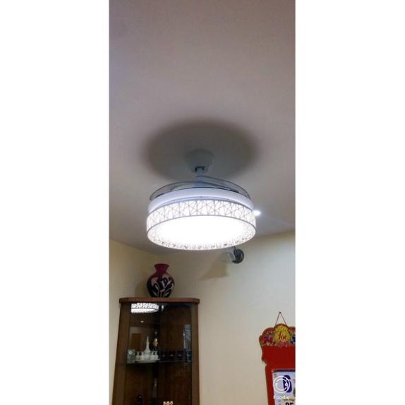 - Quạt có khả năng cụp xòe. Khi bật lên quạt xòe ra như 1 chiếc quạt thông thường. Khi tắt quạt đi thì tự nhiên cụp vào như một chiếc đèn chùm