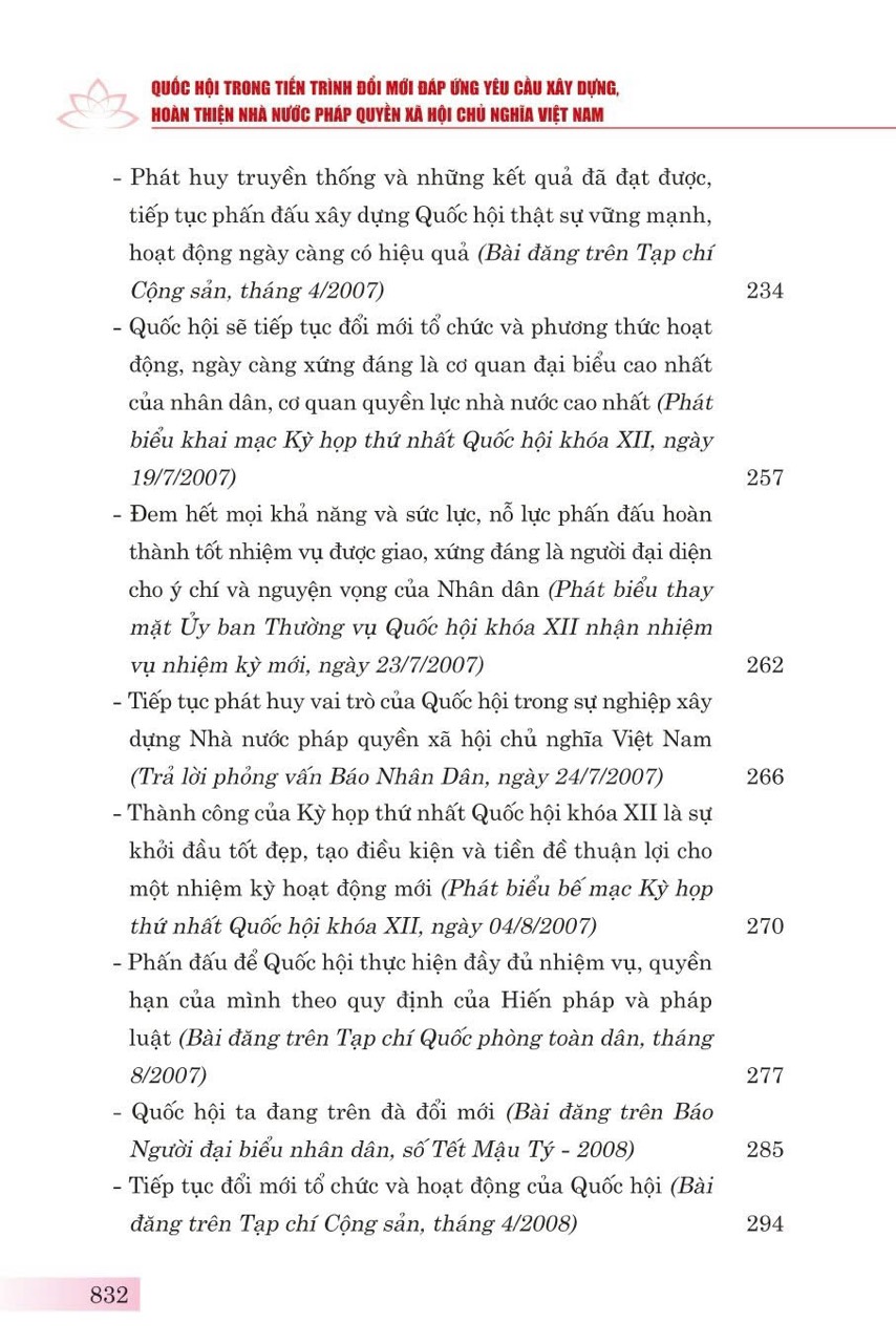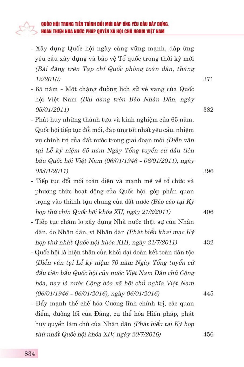 Nhằm hệ thống những quan điểm chỉ đạo và định hướng của đồng chí Tổng Bí thư Nguyễn Phú Trọng đối với nhiệm vụ xây dựng, hoàn thiện Nhà nước pháp quyền xã hội chủ nghĩa Việt Nam nói chung và đổi mới tổ chức, hoạt động của Quốc hội Việt Nam nói riêng, Đảng đoàn Quốc hội phối hợp với Nhà xuất bản Chính trị quốc gia Sự thật xuất bản cuốn sách: Quốc hội trong tiến trình đổi mới đáp ứng yêu cầu xây dựng, hoàn thiện Nhà nước pháp quyền xã hội chủ nghĩa Việt Nam.