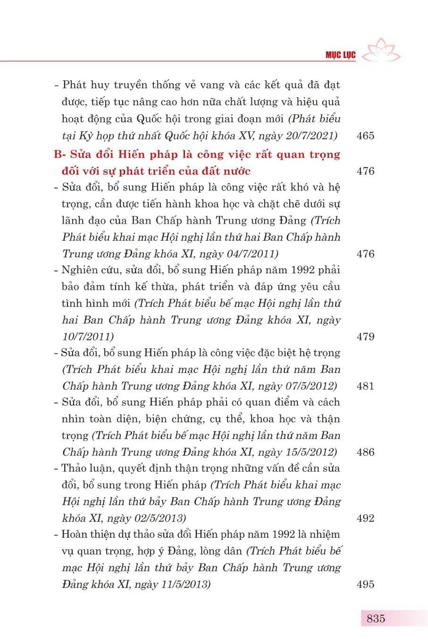 Phần thứ nhất: Xây dựng và hoàn thiện Nhà nước pháp quyền xã hội chủ nghĩa Việt Nam, gồm 15 bài viết, bài phát biểu, trả lời phỏng vấn của đồng chí Tổng Bí thư Nguyễn Phú Trọng về các vấn đề: chủ nghĩa xã hội và con đường đi lên chủ nghĩa xã hội; xây dựng, hoàn thiện Nhà nước pháp quyền xã hội chủ nghĩa và các thiết chế trong Nhà nước pháp quyền xã hội chủ nghĩa Việt Nam.