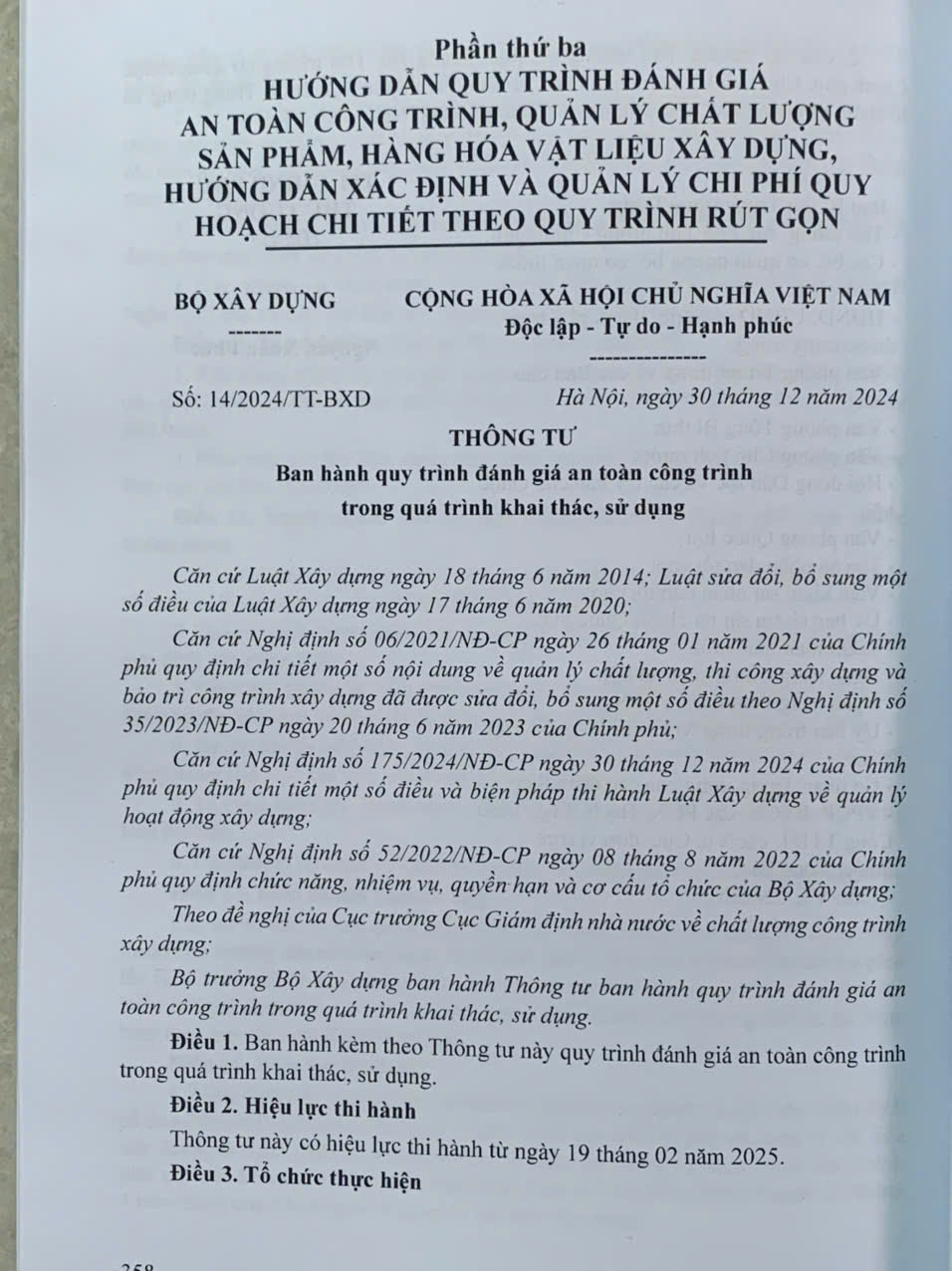 Quy định chi tiết thi hành Luật Xây Dựng về quản lý chất lượng, thi công xây dựng và bảo trì công trình xây dựng Tác giả: Tài Thành (Hệ thống) Nhà xuất bản: Hồng Đức Công ty phát hành: Công ty TNHH Sách Luật VN Ngày xuất bản: 3.2025 Số trang: 406 trang Khổ sách: 19×27 cm Giá bìa 395.000 Thời gian qua Quốc hội, Chính phủ và Bộ ngành đã ban hành nhiều văn bản Luật liên quan đến Luật Xây dựng và nhiều Nghị định mới như: Nghị định số 175/2024/NĐ-CP ngày 30 tháng 12 năm 2024 quy định chi tiết một số điều và biện pháp thi hành Luật Xây dựng về quản lý hoạt động xây dựng. Thông tư số 10/2024/TT-BXD ngày 01 tháng 11 năm 2024 của Bộ Xây dựng về quản lý chất lượng sản phẩm, hàng hóa vật liệu xây dựng. Thông tư số 02/2024/TT-BXD ngày 20 tháng 5 năm 2024 của Bộ Xây dựng hướng dẫn xác định và quản lý chi phí quy hoạch chi tiết theo quy trình rút gọn… Nhằm có tài liệu tuyên truyền những quy định pháp luật mới trên đến các cơn quan, đơn vị, doanh nghiệp và cá nhân liên quan có tài liệu tham khảo áp dụng trong công việc Nhà xuất bản Hồng Đức xuất bản cuốn sách: QUY ĐỊNH CHI TIẾT THI HÀNH LUẬT XÂY DỰNG VỀ QUẢN LÝ CHẤT LƯỢNG, THI CÔNG XÂY DỰNG VÀ BẢO TRÌ CÔNG TRÌNH XÂY DỰNG Nội dung cuốn sách gồm các phần sau: Phần thứ nhất. NHỮNG QUY ĐỊNH MỚI VỀ LUẬT XÂY DỰNG Phần thứ hai. QUY ĐỊNH VỀ QUẢN LÝ CHẤT LƯỢNG, THI CÔNG XÂY DỰNG VÀ BẢO TRÌ CÔNG TRÌNH XÂY DỰNG Phần thứ ba. HƯỚNG DẪN QUY TRÌNH ĐÁNH GIÁ AN TOÀN CÔNG TRÌNH, QUẢN LÝ CHẤT LƯỢNG SẢN PHẨM, HÀNG HÓA VẬT LIỆU XÂY DỰNG, HƯỚNG DẪN XÁC ĐỊNH VÀ QUẢN LÝ CHI PHÍ QUY HOẠCH CHI TIẾT THEO QUY TRÌNH RÚT GỌN Trong quá trình hệ thống không tránh khỏi những sơ sót nhất định, chúng tôi mong muốn nhận được những góp ý từ bạn đọc để cuốn sách được hoàn thiện trong những lần tái bản sau.