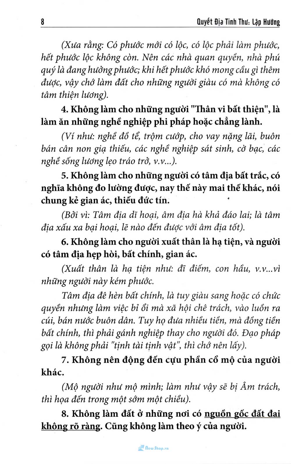 Cuốn sách khẳng định lập hướng có năm bảy cách, người theo Long, kẻ theo Thủy,áp nào cũng có cái hay riêng của nó; chọn sao cho nhiều tốt ít hung là được, trong thế gian không có gì thập toàn, thập mĩ cả.