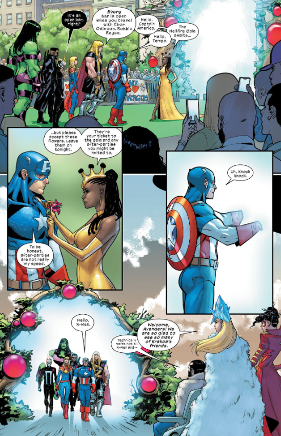 Party time in the Reign of X! The Hellfire Gala is the biggest mutant event of the season, and Emma Frost is your host for a night of dinner, drinks and deceit. Everyone will be there, dressed to the nines — your favorite mutants, their closest allies…even their worst enemies! X-Force will be on hand to deal with any troublemakers and gatecrashers — but can the Hellions somehow get an invitation, or will they be turned away at the door? Meanwhile, for Captain Britain and Excalibur, the Gala may result in a diplomatic incident! Either way, raise your glasses for the first big moment of the night — the eagerly awaited announcement of Krakoa’s very first elected team of X-Men!