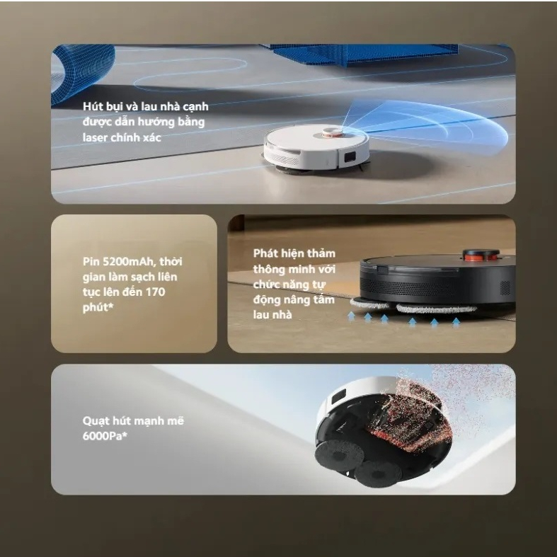 Tích hợp công nghệ Quét laser 3D định vị hệ thống hiển thị bản đồ toàn bộ ngôi nhà. Chốt quét: 2 chiếc Tự động quay về dock sạc, leo dốc 3cm. Thời gian sạc