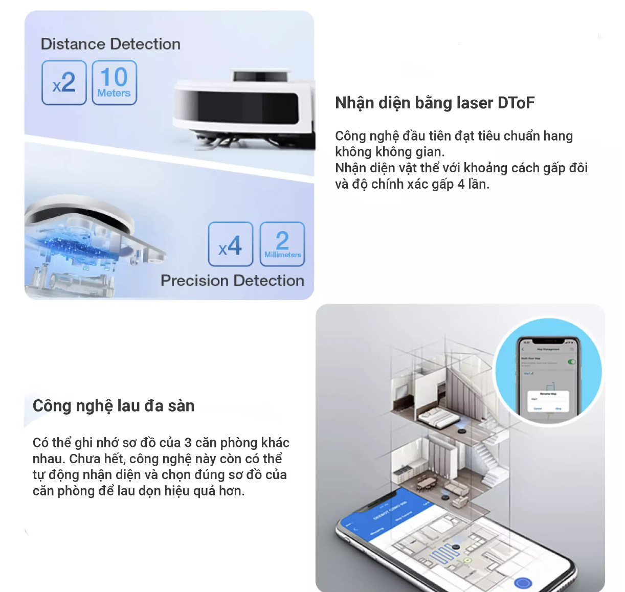 Tích hợp công nghệ Quét laser 3D định vị hệ thống hiển thị bản đồ toàn bộ ngôi nhà. Chốt quét: 2 chiếc Tự động quay về dock sạc, leo dốc 3cm. Thời gian sạc