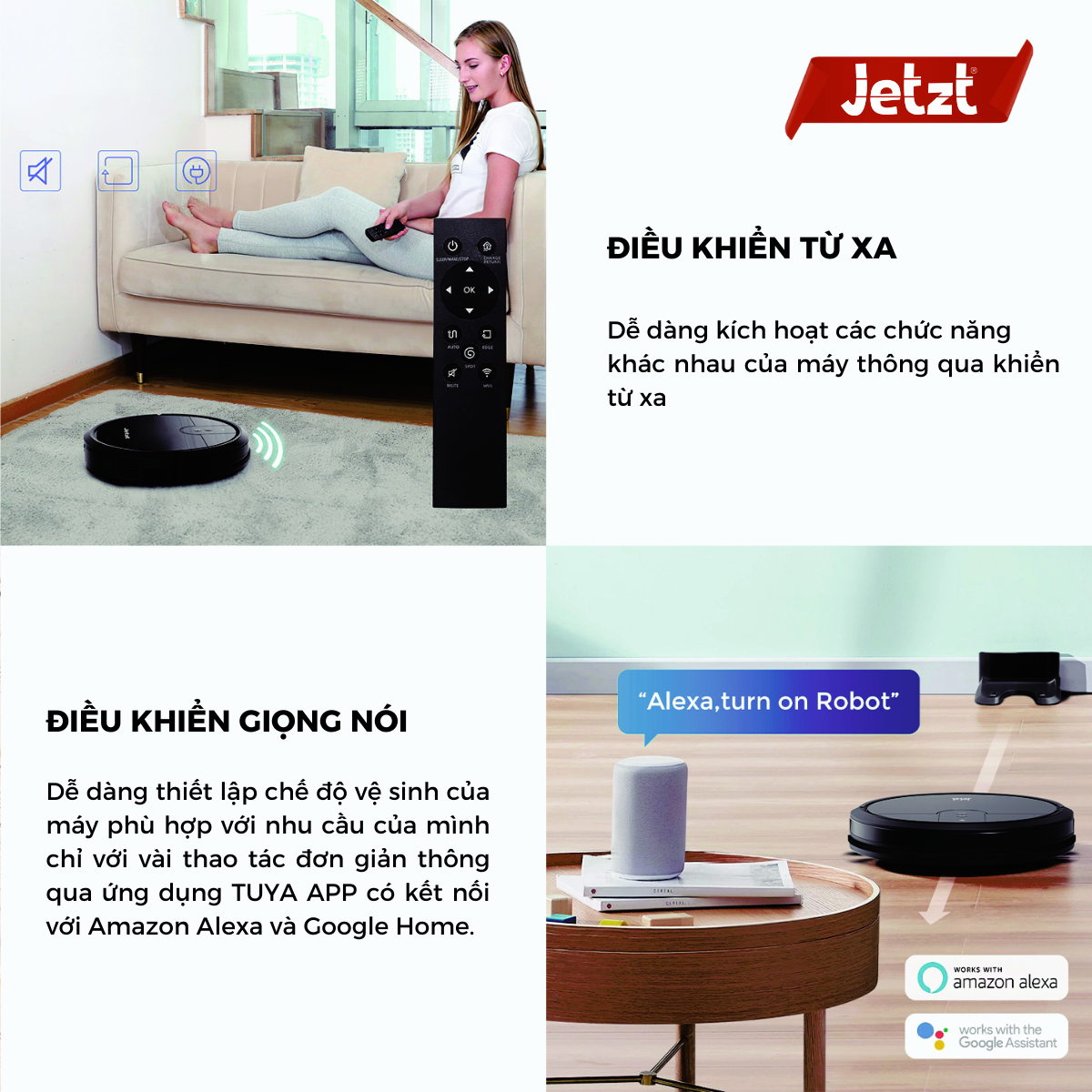 Chế độ làm sạch sâu theo điểm (Spot mode): Làm sạch sâu theo một khu vực xác định HỆ THỐNG LÀM SẠCH 3 CẤP ĐỘ 1. Quyét: Hai chổi phụ hoạt động mạnh mẽ có tác dụng thu gom rác và làm sạch cả các ngóc ngách (góc tường, chân cầu thang, …) 2. Hút: Lực hút mạnh mẽ kết hợp cùng khe hút rộng dễ dàng hút sạch bụi mịn, tóc, lông thú cưng và các loại rác nhỏ. 3. Lau: Miếng giẻ lau được trang bị giúp tối ưu hóa khả năng làm sạch và đánh bay triệt để các vết bẩn của máy. PHỤ KIỆN ĐI KÈM - 01 Dock sạc - 02 Chổi và 01 Giẻ lau THÔNG TIN XUẤT XỨ SẢN PHẨM: Đơn vị thiết kế và chịu trách nhiệm chất lượng: JETZT Techonology Innovation PTE.,LTD ( Singapore)